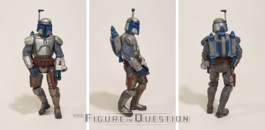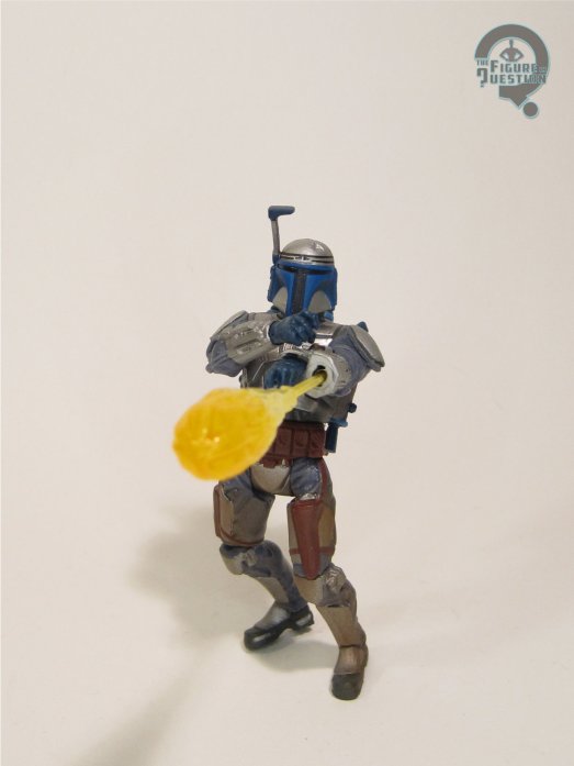 Jango Fett (Final Battle) is figure 31 in the Star Wars Saga line, which ran alongside Attack‘s release. He was one of the three Jangos available at launch, and the second of the two “standard” ones. The figure stands 3 3/4 inches tall and he has 13 points of articulation. His articulation, like so many of the Saga figures, is mostly pointless, thanks to how heavily pre-posed these figures were. In Jango’s case, that pre-posing is exceedingly awkward, and doesn’t really much allow for…anything. He’s also super hard to stand, largely because what even are his legs supposed to be doing? What’s crazy is the’s got actual knee joints, a thing that were still not exceedingly common at this time, and they’re useless, which is just laughable. On the plus side, I guess the actually quality of the sculpt isn’t bad. It’s clean and the detailing is sharp, and he’s pretty accurate to the movie. The biggest drawback (other than the posing) is the advertised action feature, where his gauntlet launches a fire-shaped missile. It’s not very effective, and it means his left arm is misshapen. Making up for it, however, is the unadvertised second action feature. Saga made use of magnets on a number of figures, and a recurring instance was for easily removable body parts, to simulate the damage characters might take. In Jango’s case, his whole neck joint’s a magnet, so you can behead him, easy-peasy. It’s so freaking morbid, and I absolutely love it. Jango’s paint work is a bit murky, which wasn’t uncommon in this era. He’s got a lot of fake dirt build-up, which is definitely a bit too heavy. It’s at least all pretty cleanly applied, so there’s that. Jango is packed with the fire projectile, as well as his twin pistols. Unfortunately, the holsters are non-functioning on this release, so there’s nowhere to store them.