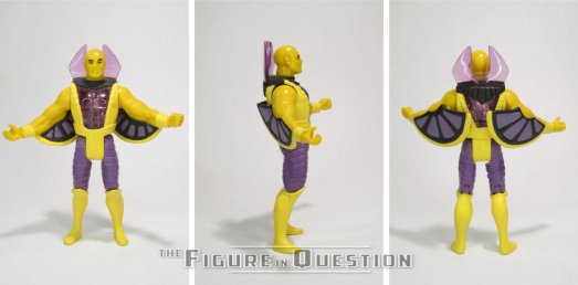 Golden Pharaoh was part of Super Powers‘s third abs final assortment, released in 1986. Obviously, this was his first figure, and like his fellow Kenner creation Cyclotron from the same year, it would be his only figure until DCUC. The figure stands about 4 1/2 inches tall and has 7 points of articulation. While the general set-up of his articulation is pretty standard for the line, the positioning of his arms, coupled with the nature of his costume design with the wings and all, limits his range on the shoulders a fair bit. The neck is also rather stiff on mine, but that might also be linked to the age of the translucent plastic, and I’m certainly not gonna force it. Pharaoh’s sculpt was unique, based on Jack Kirby’s design work for the character. It’s certainly a unique look, and while the sculpt proper is a little soft in some spots, it generally works out alright. He’s got a rather basic color scheme. It’s certainly an odd of assortment of colors, and notably no actual gold (something that was ultimately addressed by the DCUC figure). I do dig the translucent purple on the torso, though. Golden Pharaoh was packed with a staff, which he can hold in his right hand. He also had a “Power Action Soaring” feature, which pops his arms upward when his legs are squeezed.