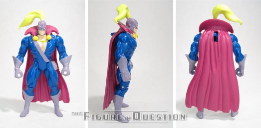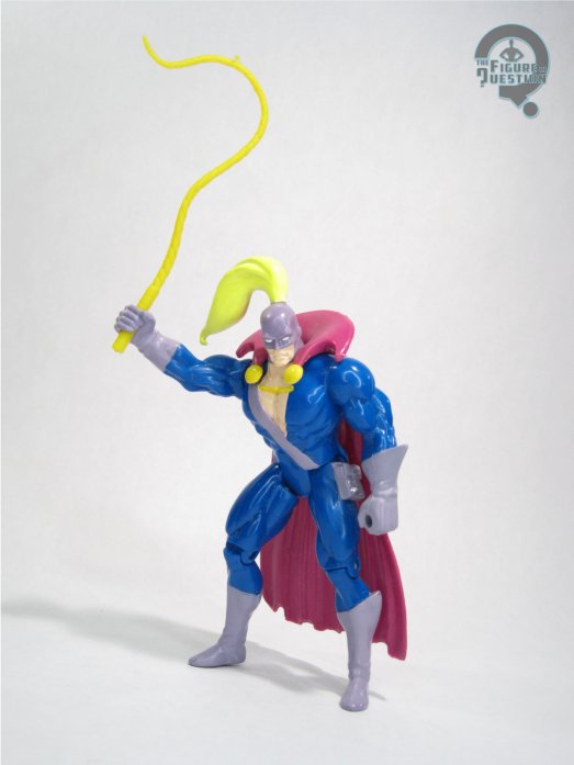 Blacklash is part of Series 1 of Toy Biz’s Iron Man line, as part of the small batch of villains at launch.  He’s based on Blacklash’s design from the show, which is in turn based on his Justin Hammer-designed gear from the comics.  The figure stands just over 5 inches tall and he has 7 points of articulation.  His construction is on the simplistic side, and he’s notably missing any elbow articulation.  I guess maybe it’s to aid in the action feature?  It makes him quite stiff, as does the cape piece, which is large, heavy, and also doesn’t stay on so well.  The head’s actually pretty good, so good, in fact, that Toy Biz re-used it a bunch, minus the weird ponytail.  It’s definitely the best part of the figure.  His paint work is reasonably well done.  It’s a little sloppy, but certainly not the worst I’ve seen from this line.  Blacklash is packed with a whip and nunchucks, which work with his arm swinging feature.  He also gets the ID badge that all of the non-armored figures got.