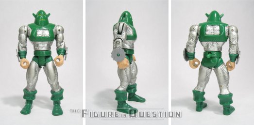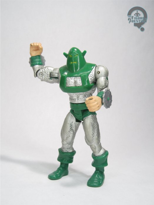Whirlwind was released in the second series of Toy Biz’s Iron Man toy line. He’s based on his animated incarnation, which was in turn based on his classic costume, more specifically his second costume design after he added the chain mail and also added a shirt. Thank you for that, Whirlwind. The figure stands about 5 inches tall and he has 9 points of articulation. The articulation on this one is kind of interesting because it’s a sort of a mix of unique and kind of basic. He loses the knee joints, which had become fairly standard of this point, but has disc and peg shoulders. The shoulders are rather loose in order to facilitate his action feature. He also has a waist swivel, but again it’s restricted to facilitate his action feature and isn’t really much for posing. His sculpt is pretty much on par with what we expected from the line. He is a little on the bulky side, but also not bad for Whirlwind. The chainmail detailing is actually pretty good. The hands and feet seemed rather large, and conversely the helmet feels a little small, like it might be difficult