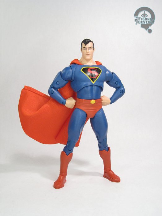 #1000 mold, which isn’t great, but Todd actually listened to fan feedback and moved him to the more recent set-up. I gotta say, I really like it. It’s quite clean and the proportions are pretty well balanced. It also especially works for this era of the character. He gets a new head sculpt, which is quite solid. It’s a good match for the animation, not being too simple or too detailed, and it sits really well on the body. He gets a cloth cape, which is fairly similar to the one on the Reeve Superman. It’s a solid work, and the wires are quite strong, which is great for posing. His color work does a pretty respectable job matching up to the colors from the cartoons. The paint’s a bit minimal, but it does what it needs to. I particularly like the squinty eyes. Superman is packed with two sets of hands, in fists and flat, as well as a display stand and a card with decidedly not Fleischer Superman on it.