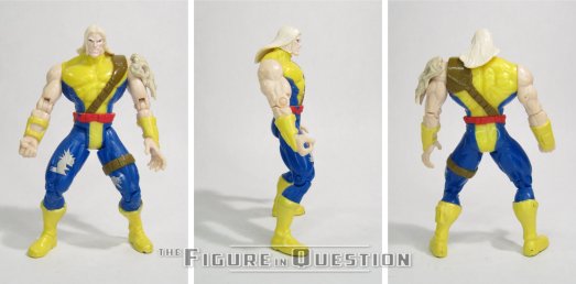Joseph is seen here with his one and only action figure. There’s something ironic about said only figure not even being a standard look, but it’s at least just a slight variation, and not as far removed as some of the others. He’s got his same core look, that being the basic blue-and-gold suit, but it’s now sleeveless and he’s added a few things on top of it. The figure stands a little over 5 inches tall and he has 10 points of articulation. Joseph is another re-use heavy figure, making use of a large number of parts from the Age of Apocalypse Cyclops. He gets a new head and left arm. The arm is really just designed to mimic the right, removing the asymmetric armoring of the Cyclops. It also adds an animal skull armor piece to the shoulder. The new head is quite a nice piece, and manages to capture Joseph’s usual depictions pretty well, while also fitting nicely with the base body. The long hair does mean he lacks a lot of neck mobility, but it’s still better than nothing at all. His color work is generally okay; there’s a slight metallic finish to the uniform, which I rather like. The only thing I’m not crazy about is the painted on rips to the uniform. They don’t match the actual molded skin tone, and they end up just looking a bit hokey. Ultimately, it’s the one thing the figure would be better without. Joseph is packed with a disc launching accessory, which can sort of double as a bladed weapon and a shield.