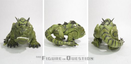 Grovel’s a big space lizard, and that’s what this figure aims to be. He’s a big, chunky thing, a fair bit larger than Spat. Exactly *how* much larger than Spat he’s supposed to be varied a bit in the comics, so the figure just goes for demonstrably larger, and makes it work. He’s got base movement at the top of each leg, and the tail can twist, so there’s some slight variation in play. He’s also got a mouth opening action feature; pushing down the front-most fins opens the mouth up a fair bit. He’s got some cool patterning for the paint work, which is pretty fun to look at, and generally sells the whole “giant space lizard” bit rather well.