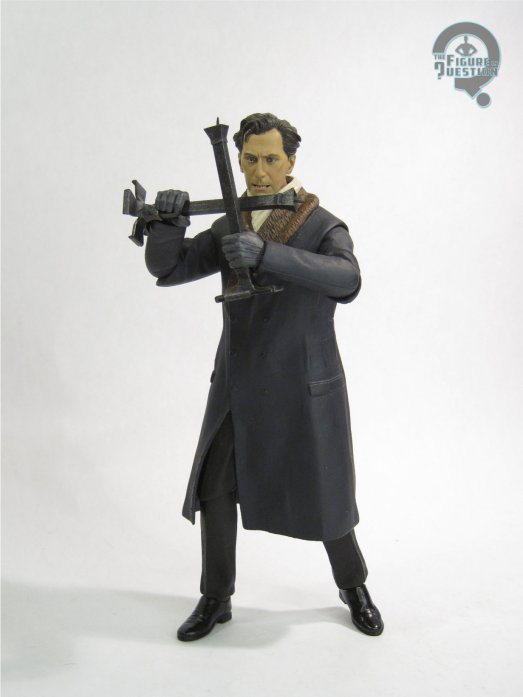 Van Helsing is an Ultimate release from NECA, the second in their Hammer Horror Horror of Dracula set, following the Christopher Lee Dracula figure released last November.  He started hitting about a month or so ago, so, you know, quite a while after the Lee Dracula had completely dried up at retail.  I’m sure that won’t affect his sell-through at all, right?  Like the Count, he’s based on his look from Hammer’s first Dracula film, which makes a lot of sense, it being the most distinctive and all.  The figure stands about 7 inches tall and he has 30 points of articulation.  His articulation scheme is pretty standard for NECA at this point.  It has its ups and its downs.  There’s certainly some spots where he’s very restricted, but he can generally get into all the poses you might need him to.  Van Helsing’s sculpt is all-new, and handled by NECA sculptors Kyle Windrix and Trevor Grove.  It feels pretty in-line with modern NECA horror offerings.  In his default configuration out of the box, he’s got his overcoat, scarf, and hat.  The hat is attached to the head, and that particular head probably has the weakest of the Cushing likenesses here.  There’s a more standard head, sans hat, which has a more neutral expression, and is generally pretty well-kempt, and it’s probably the best of the Cushing likenesses. Lastly, there’s a more disheveled sculpt, with a more intense expression, clearly patterned on his look during the final battle.  While I don’t think the likeness itself is quite as strong as the neutral one, it’s the sculpt that I feel best captures the character, and by far my favorite.  The overcoat-ed look is more on the restricting side in terms of movement, but is of course a signature look, so it’s the one that I see getting the most play.  That said, this figure comes with a whole extra torso you can swap out, which has him in a vest and tie with his sleeves rolled up.  It’s not a signature a look, but it’s got some better movement.  The figure’s paint work is all pretty good.  It’s a little thick on the skintones, but generally everything looks pretty clean, and he’s reasonably life-like.  In addition to the three heads and two torsos I discussed above, Van Helsing is packed with five pairs of hands (tight grip, loose grip, and relaxed for gloved, and tight grip and relaxed for ungloved), a hammer, a single stake, a bundle of stakes, a crucifix, and the two candlestick holders he uses to make his makeshift crucifix in the finale.  It’s all cool and good, but genuinely the candlestick holders are the only thing that truly matter to me, since they’re such a signature thing.