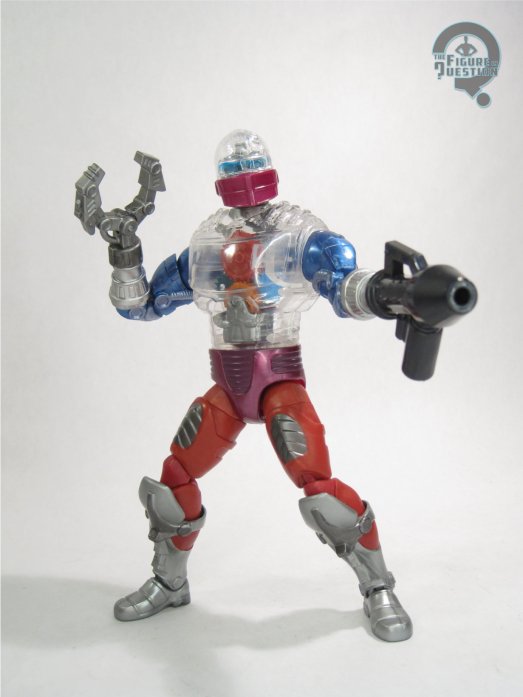 up, he’s an all-new sculpt. It takes the broad strokes designs of the vintage figure and sort of does its own sort of thing with them. He’s a bit more rounded, especially on the torso and head designs, and there are more intricate elements worked into things. The head is more involved than we tend to see, using a three-piece assembly. He’s got the usual mouth guard, as well as a “helmet” piece, both of which can be removed to reveal a robotic skull underneath. The torso brings back the gear turning action feature we frequently see with this guy, which is a lot of fun. The color work on this figure is in keeping with the generally metallic leanings of the more recent New Eternia figures, which I do rather like. The helmet is totally clear, which makes for an iffy look in the photos, but looks really, really nice in person. Roboto is packed with an alternate take on his mouth guard, a standard right hand, and axe, blaster, and claw attachments, which pretty much cover all of the basics.