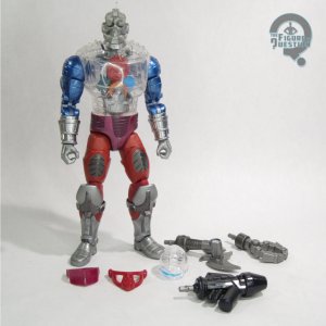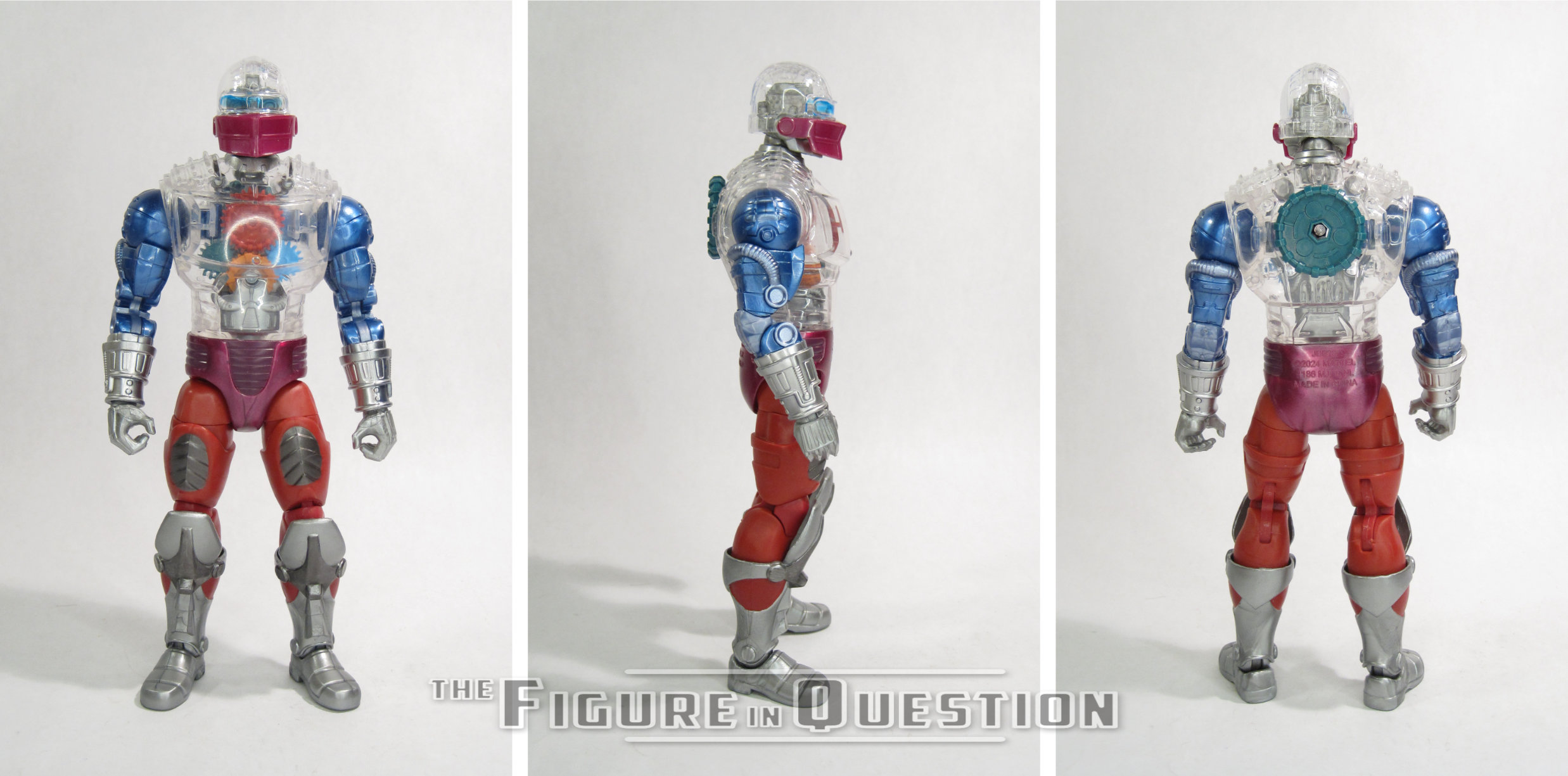 up, he’s an all-new sculpt. It takes the broad strokes designs of the vintage figure and sort of does its own sort of thing with them. He’s a bit more rounded, especially on the torso and head designs, and there are more intricate elements worked into things. The head is more involved than we tend to see, using a three-piece assembly. He’s got the usual mouth guard, as well as a “helmet” piece, both of which can be removed to reveal a robotic skull underneath. The torso brings back the gear turning action feature we frequently see with this guy, which is a lot of fun. The color work on this figure is in keeping with the generally metallic leanings of the more recent New Eternia figures, which I do rather like. The helmet is totally clear, which makes for an iffy look in the photos, but looks really, really nice in person. Roboto is packed with an alternate take on his mouth guard, a standard right hand, and axe, blaster, and claw attachments, which pretty much cover all of the basics.