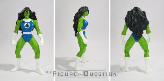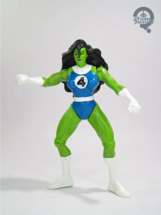 She-Hulk is the seventh mail-away exclusive through ToyFare magazine, specifically offered up as an incentive for purchasing a year’s subscription in 1998. This was Toy Biz’s second go at She-Hulk, which honestly makes her something of a rarity for the mail-aways, who tended to be new characters. In fact, she’s also a pretty notable character in general, compared to the other caliber of characters generally offered. The figure stands about 7 inches tall and she has 8 points of articulation. Her mold originally hailed from the Hulk line, which was made up of a lot of rather large figures. She-Hulk was no exception. She’s not incredibly posable, though. The lack of neck or elbows, and the choice to give her the dreaded v-hips means she’s really only good for standing. And even that’s a bit iffy, if I’m honest. The sculpt is…well it is what it is. It’s kind of soft, except for the hair, which is surprisingly sharp by comparison. Her arms are rather long and her proportions are weird. With all of the crazy builds of the characters in the Hulk line, I guess this one just sort of threw them for a bit of a loop. It’s not awful, but not great. Her distinguishing feature here is the paint work. She’s got the FF uniform in place of her purple leotard, as seen in the comics. It matches the earlier Fantastic Four line’s version of the team, so she can fit right in, even if that does mean that she’s got bright blue on the costume when it *technically* should be black, or at least a very dark blue. I’ll give them a pass, since correcting it for her would mean she wouldn’t match the other figures.