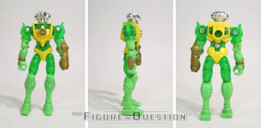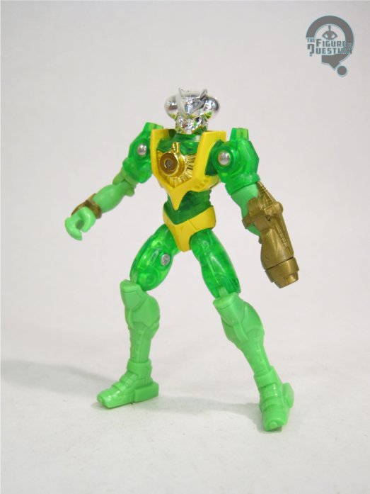 Edison is figure 004 in Takara’s Microman Magne Power line, released in 1999. He’s the second to last of the five-man team that made up the core focus of this new line. The figure is about 3 inches tall and he has 12 points of articulation. The Magne Power line was unique in its scaling; they weren’t the traditional 3 3/4 inch figures, but a bit smaller. All of the original five were identical sculpts from the neck down. It’s a sculpt that’s certainly a product of its time, with some rather pronounced proportions, and the very awkward magnet arm attachment on the left arm that removes the elbow joint. It’s an interesting offering, especially so close to the immensely revamped Microman base body Takara would transition to very shortly after. It feels like the last hurrah of the older style. Each of them got a unique head. In Edison’s case, it’s a helmet, patterned on a sort of grasshopper style. It’s a little goofy, but certainly fun. Edison’s primary color is green, so there’s a lot of that. He’s got a mix of translucent and opaque, as well as some yellow and gold accenting. And, of course, he’s got the chrome head, which is always super cool. The standard figures didn’t get any extras, but they do have magnets in their left hands and torsos, which are fun for sticking them to fridges or metal shelves and the like.