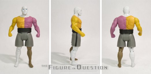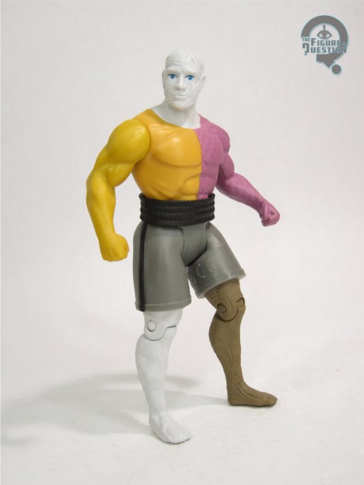Metamorpho (Movie) was released in Series 12 of McFarlane’s Super Powers line. He’s the fourth of the five single-carded movie tie-in figures. Like Guy, this is Metamorpho’s second Super Powers figure, following up on a comics release from last year. The figure stands just over 5 inches tall and he has 7 points of articulation. He uses a lot of parts from the comic Metamorpho, specifically the torso, arms, and lower right leg. He gets a new head, upper legs, and lower left leg, as well as a new belt piece. The movie’s design is ultimately pretty faithful to the classic comics look, so the re-use is pretty sensible, and the new parts help to bring him more in line with the movie’s adjustments. I actually find myself preferring the head sculpt on this one to the comics version; it’s just got a little bit more character. As with all of the head sculpts from these figures, the likeness isn’t really a match for Carrigan, but it’s close enough to sort of suggest him. Perhaps the oddest part of the mix of old and new parts is that the texturing on his face disappears when you get to his neck, but other than that, things work pretty nicely. The color work on this Metamorpho is notably a bit more desaturated than his comics counterpart. It still very much reads as Metamorpho, though, and I’m glad that this time they did a better job of consistent paint versus no paint on similarly colored sections. There’s a little bit of slop on the change-over from his right leg to his shorts, but otherwise the application is pretty clean.