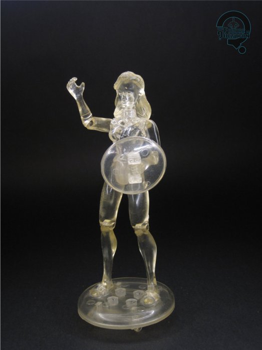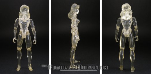 Invisible Woman was released in Series 2 of Toy Biz’s Fantastic Four line. Like her brother Johnny, the intent was for the Series 2 figure to be Sue’s first figure in the line, but retailers balked at the idea of not having the complete team at launch, resulting in a repainted Spider-Woman that served as a stand in, until the real thing arrived later. The figure stands 5 inches tall and she has 9 points of articulation…sort of. The neck joint is especially restricted to the point of effectively not being there. Still, she at least gets elbow joints, making her more posable than her predecessor. The sculpt here was all-new to this figure, but would later become a favorite of Toy Biz’s during their heavier repaint days. It’s not a bad sculpt. Perhaps a touch skinny on the limbs, but generally good, and in keeping with her animation model from the show. The initial prototype for this figure was in standard colors, but when they did the stand-in figure for Series 1, so was that one. In an effort to be more unique, this figure was molded entirely in clear plastic, simulating her abilities. The irony of it all is that this sculpt never ended up being released in actual color as Sue, not even for all the repaints. It works alright, and apart from some minor yellowing, it’s still pretty good. She was packed with a wheeled stand and a small shield, which are similar to the ones used on the Series 1 figure, but ultimately totally unique.