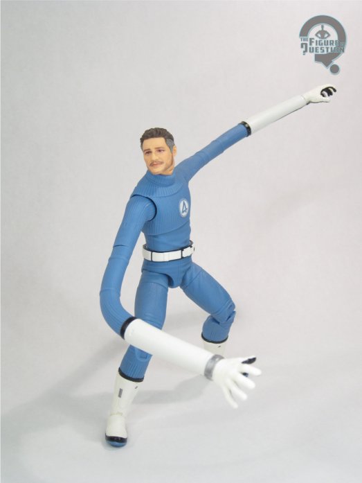 Mr. Fantastic is part of the First Steps tie-in assortment of Marvel Legends, which hit just before the film’s release, earlier this month. The figure stands 6 1/4 inches tall and he has 30 points of articulation. Like the rest of the team, Reed’s seen here in his main team suit, with the closest ties to their standard suits from the comics. While the comic suits tend to be uniform across at least three of the four, the movie differentiates them a bit more between the team. Reed’s is notable in its omission of any white accenting around the collar, making it the most understated of the suits. His sculpt is unique to him, and generally pretty solid. The face notably has a very strong likeness of Pascal, even better than the ones we’ve seen for The Mandalorian. It even got the Matthew seal of approval, for what it’s worth. The hair’s a bit shorter and closer cropped at the top than it actually is in the film; it looks like it’s based more on the early promo work for the film than the actual film proper. It’s not too terribly far off,
