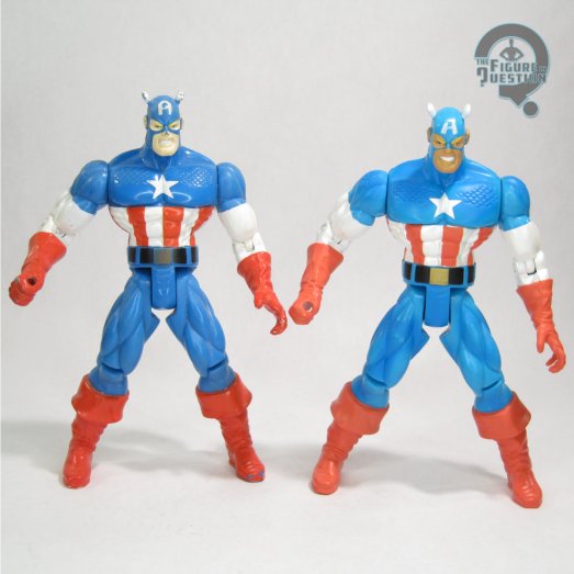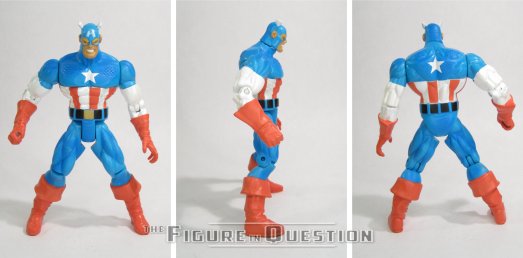There were seven Captain Americas in Toy Biz’s 5-inch line, and four of them were variations on the same figure.  This is one of those four.  The figure stands about 5 3/4 inches tall and he has 9 points of articulation.  His mold is a re-use of the Electro Spark release from the Spider-Man line in 1996.  The mold has its ups and its downs.  It was certainly one of Toy Biz’s favorites for the character, but it’s rather big and bulky, and he’s quite angry looking.  All that said, it’s got a sort of quaintness to it, and I find myself always enjoying it whenever I mess with it.  The sculpt remains unchanged here, so this figure has two notable change-ups.  Firstly, there’s the paint work.  The actual paint masks remain the same as the Electro Spark version, but the colors themselves have changed.  The blue is notably a much brighter shade, his skin isn’t quite as pale, and the white sections have a more pearlescent sheen.  On my copy, the general application also seems to be a little cleaner than his earlier release.  It’s just a much better set-up than the prior figure, and really the best this mold got to look.  The other change-up is on the accessories, or rather accessory.  He drops the weird transforming armor bit, and instead of the really thick light-up shield, he gets a more proper version, which is similar to the one with the Marvel vs Capcom figure, but less fragile.