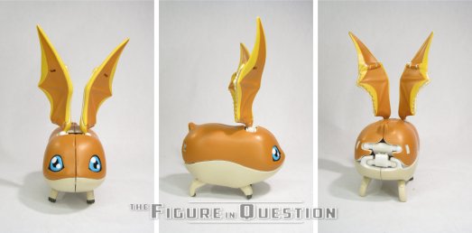 to the wings, which look passable but not great from the front, and look not at all correct from literally any other angle. This is, of course, all for the sake of facilitating the transformation into Patamon. The bulk of Patamon’s design is on the exterior of Angemon’s wings. You fold him up into a fetal position and fold the wings around him and, boom, incredibly oversized Patamon. 25 years after its release, the plastic is a touch stiff, so the transformation is a bit tricky, but hardly impossible. Patamon is a lot more on model, with all of the Angemon stuff successfully packed away from view. The paint work for both forms is pretty nicely handled. Angemon gets all the base color work he’s supposed to, and Patamon gets a completely painted surface. Angemon being largely white plastic makes him a little prone to yellowing, and Patamon being flat paint makes him a little prone to scuffing, but overall, they still look good. The figure includes Angemon’s staff, which can be folded in the middle and stored while he’s in Patamon mode. It’s got a rather obvious hinge in the middle to facilitate this, but it’s on par with the rest of the figure.