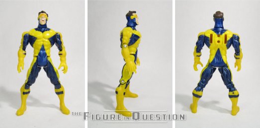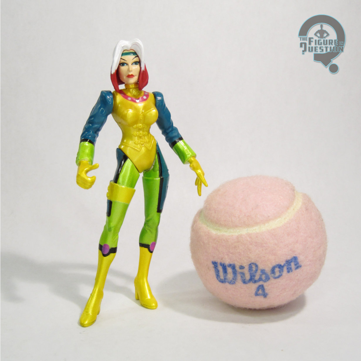 Rogue’s a pretty notable character in AoA, and honestly more noteworthy than Gambit, so the fact that she wasn’t even planned at all for the line-up does seem kind of odd. There are, notably, no women in the AoA series from ’96, so it might have been a retailer thing. At least she didn’t ultimately have to wait too long. The figure stands a little over 5 inches tall and she has 5 points of articulation. Since Rogue didn’t have a pre-existing mold sitting around to use, Toy Biz had to sort of improvise a bit. They opted to re-use the mold from the Generation X White Queen figure, which isn’t a bad sculpt, but also isn’t exceedingly much like Rogue’s design from the cross-over. I guess the head’s not too far off, and they decided to just make the rest of it work as best they