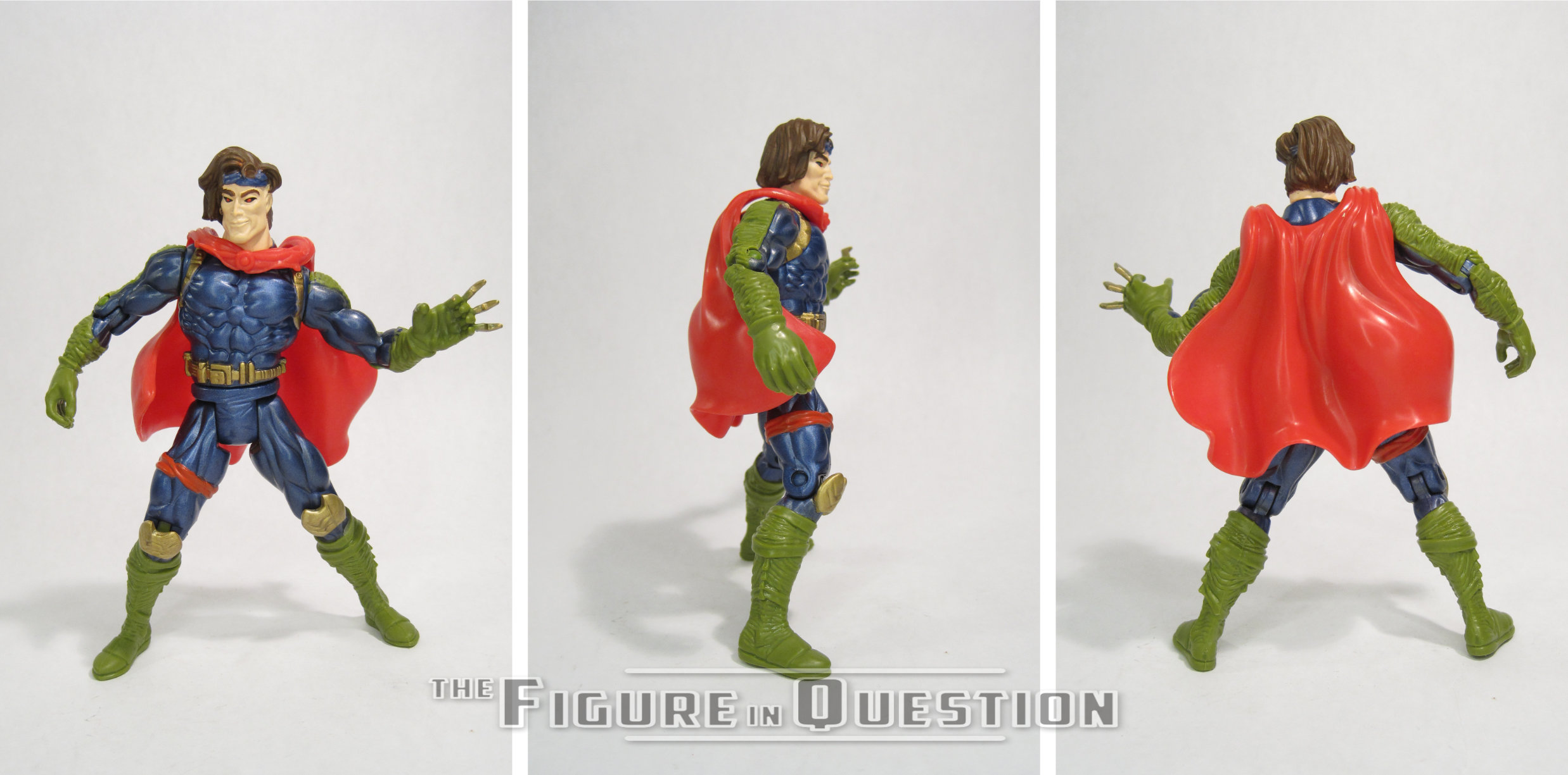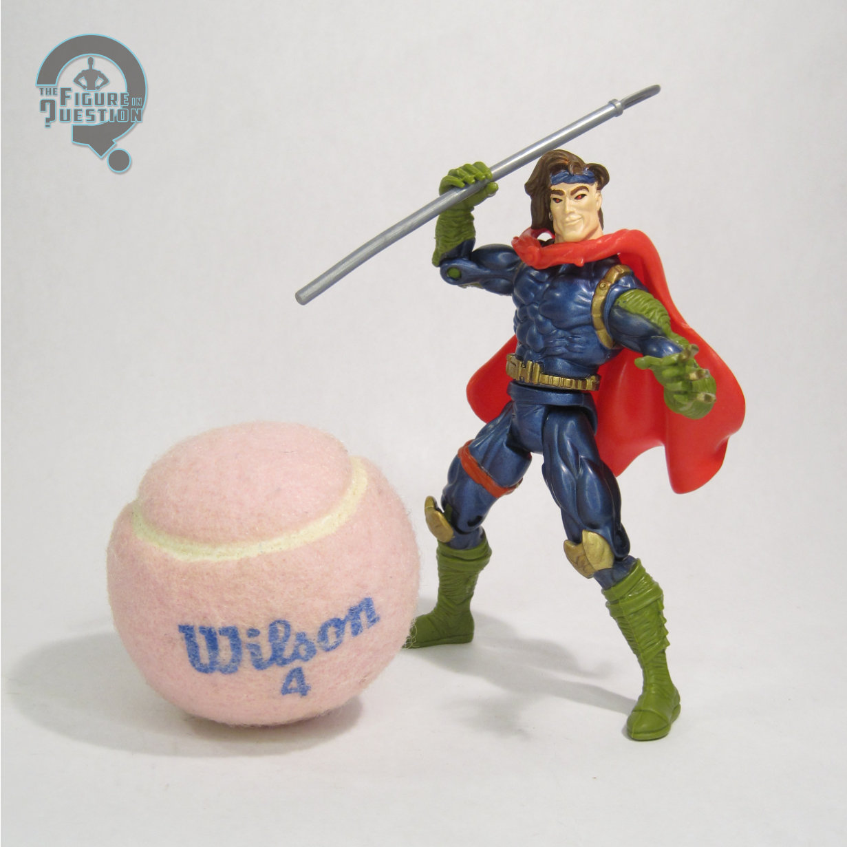 which looks pretty strange in most poses. He’s also a little tricky to keep standing. His cape is a separate piece, and it’s kind of floaty and never seems to quite sit right. His color work does alright. This design is a bit slapdash in its color choices, kind of like they just picked at random, but they replicate them well here. The application’s generally okay, though the skin tone on his face is quite thick, obscuring the sculpted details quite a bit. Gambit is packed with his staff piece, as well as an energy piece for him to throw, which is, for some reason, cast in opaque blue.