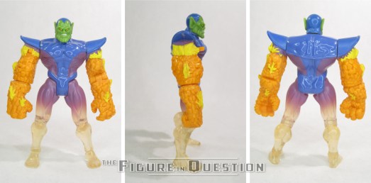 Super Skrull was released in Series 3 of Toy Biz’s Fantastic Four line, designed to tie-in with the show of the same era. Super-Skrull appeared in the show’s first season, sporting his classic design, and this figure serves as a pretty close adaptation of that set-up. The figure stands just over 5 inches tall and he has 9 points of articulation. He’s largely got the standard set-up for movement, but the right arm just gets a swivel at the elbow, rather than a hinge, due to how his action feature works. His sculpt was unique to him. It’s very…wide. Admittedly, that’s true to his Season 1 design, which was itself true to his ‘80s/early ‘90s depictions. It’s certainly not a bad sculpt, and feels pretty in line with the character. The head’s suitably angry and sporting that signature wrinkly chin, and the arms do an okay job of selling the combined powers of Reed, Ben, and Johnny. His right arm sports an action feature that extends the fist outward when the button on his shoulder is pressed. It’s the same basic gimmick used by Doom, but it makes a bit more sense here. Honestly, it’s a bit odd it never got used for Reed, since it’s his power it’s meant to replicate, but that’s a whole other thing. His color work is basic. It’s bright, and again matches the Season 1 look. I’ve never been crazy about the blue used on the cowl and mid-section of the torso; I definitely prefer the usual black there, and I don’t feel it’s a great contrast here. Otherwise, though, things work pretty well.