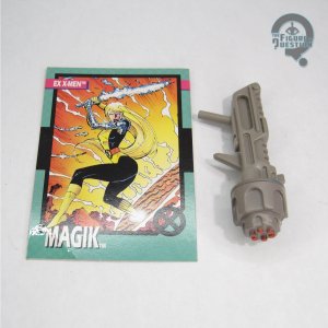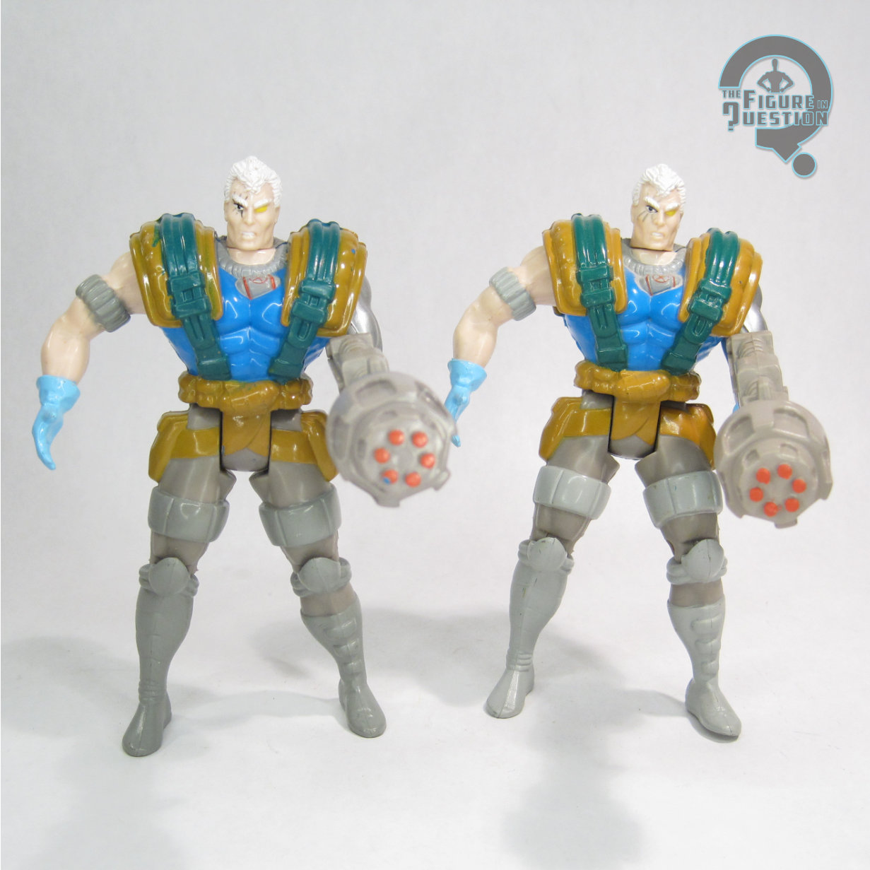 This was my first Cable and it was the earlier variant. The hinged arm did always kind of bug me, but I guess they figured with the shoulder pads he wouldn’t be getting much forward and backward movement, and they didn’t want the gun arm really wide out like the chopping arm? Another thing I always though was odd was how the peg on his gun and the hole in his hand have a flat side, so he can’t really hold other weapons besides what he came with. I also had the 10″ version of this guy, who has much more conventional articulation articulation and his head seems less narrow, but they didn’t quite nail the one thing the 5″ guy gets absolutely perfect – the sculpt of Cable’s hair. The paint tends to be a little sloppy on it, but the sculpt is like, 1:1 how Liefeld drew Cable’s hair initially. Now I have both versions opened, plus the blue and yellow repaint that came in some special store multipack, and a carded early glow in the dark one with a Cable trading card in the package where he’s in practically the same outfit. And he’s not even my favorite Cable Toy Biz did. I now have all of them, pre-Legends, thirteen at 5″, three at 10″(I especially love the one on the space Wolverine body), the little Metal Guy, and the goofy projector. I’m not even sure why I gravitated towards Cable so much as a kid, I guess it was his general Terminator vibe