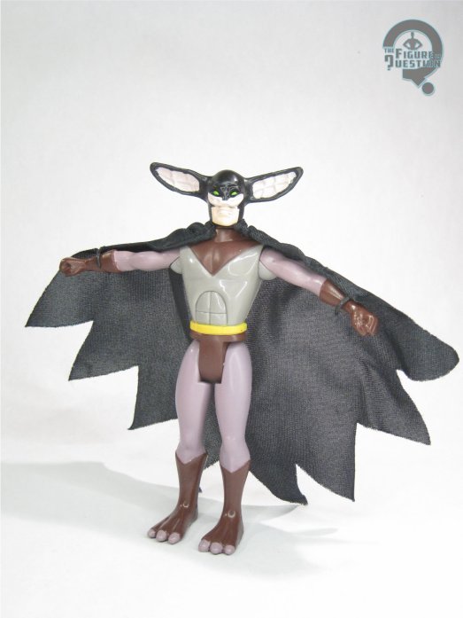 Pose Striking Die Fledermaus was released in the first series of Bandai’s The Tick tie-in line.  While most of the main cast were present in both the standard 5-inch line and the smaller 2 1/2-inch figurine line, Die Fledermaus was notable for only being in the larger scale line, making this figure his only toy.  The figure stands about 5 1/4 inches tall and he has 5 points of articulation.  Die Fledermaus, due to Bandai’s odd approach to scale, winds up as one of the tallest figures in the line, which isn’t quite accurate to the source material.  At least he was taller than Arthur.  The figure’s sculpt was unique to this release.  Die Fledermaus’s design isn’t a super complex one, but this figure notable takes an even more bare bones approach, with a sculpt that’s rather rudimentary.  The head’s quite a nice piece of work, at least, and is ultimately the best thing about it.  The mask is well defined, and there’s a clearly uneasy expression under the mask that feels very true to the character.  His body sculpt is rather lanky and tubular, which doesn’t quite feel right for Die Fledermaus, who, while not as bulky as the Tick, was usually shown as being of a moderate build.  He’s got very basic articulation, and a lot of what’s going on is worked into his “Pose Striking” action feature.  When you push up the lever on his back, his arms raise outward.  This is coupled with a cloth cape (which unfortunately lacks the more distinctive shaping at the top that it had in the show) allows him to “dramatically” flair the cape outward.  Unfortunately, it’s a very basic feature, and has no real way of locking in place, so it’s just sort of unimpressive.  Die Fledermaus’s color work once again falls into that “basic” realm, though this is one area where it’s really appropriate.  The application of paint’s generally good here, and he’s an okay match for the show.  The only downside is that he’s a victim of a line-wide issue, where his torso yellowed over time, and doesn’t quite match his limbs.