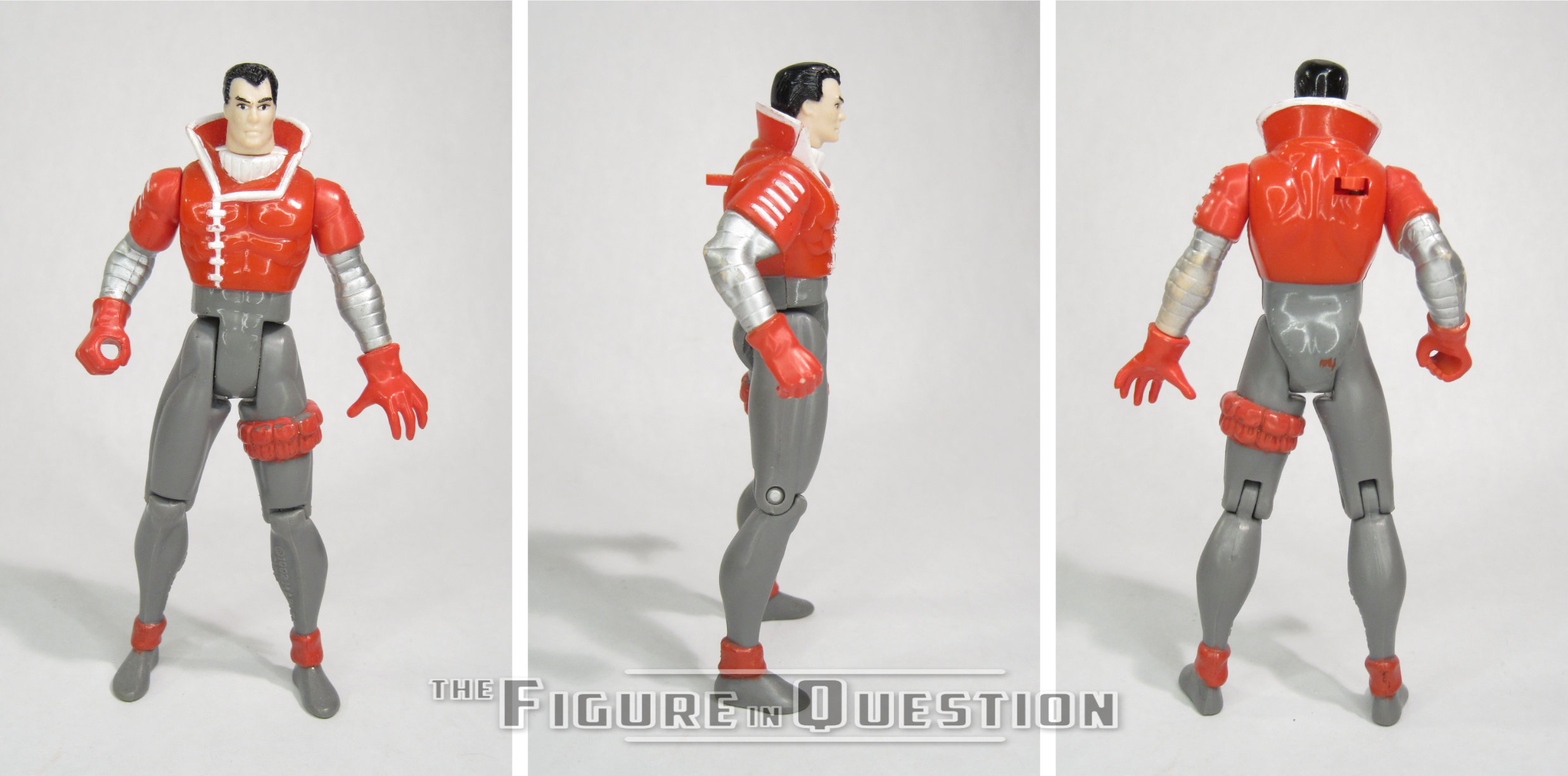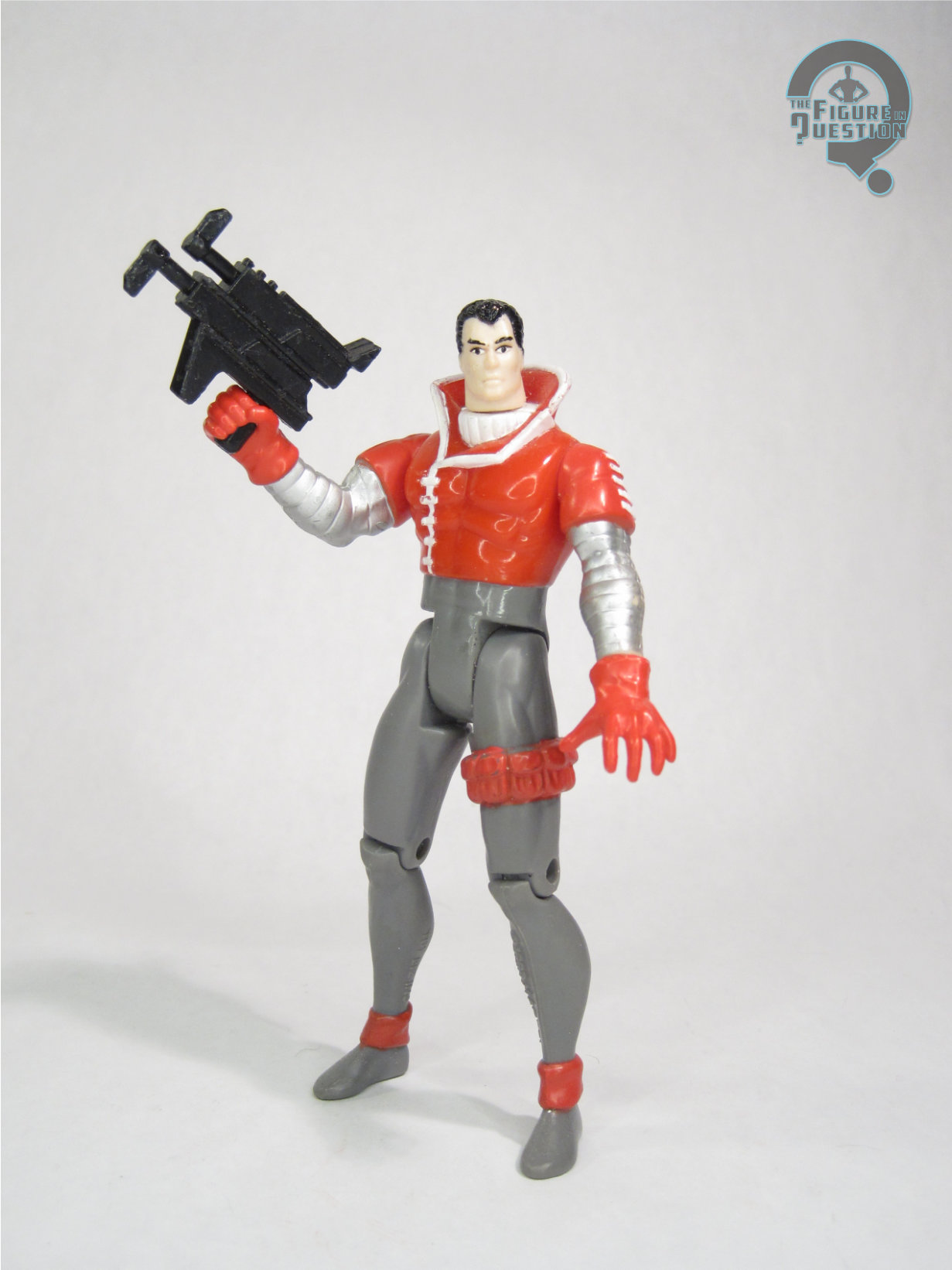 Kane was released in Series 1 of Toy Biz’s X-Force line that they spun out of their X-Men line. He was subject to no fewer than four paint variations, concerning the color of his hair and the strap on his leg, and exactly how they were combined, but the sculpt remained the same all the way through. The version seen here is the most common of the four, by virtue of being released on two separate card backs. The figure stands a little under 5 inches tall (the early X-Force offerings ran a little bit small) and he has 8 points of articulation. One of those joints is wrist movement on his left arm, which is actually just incidental movement, brought about by his “Snap Back Living Hand!” feature. His hand is attached to a string that’s on a spring mechanism; you can pull it out, and then pushing the lever on his back snaps it back into place. It’s an inoffensive gimmick, and it’s not a bad take on his “rocket-powered” hand. It does mean you and spin his wrist, though, so there’s that. His sculpt is rather common of these early figures. It’s not crazy detailed, and, especially compared to Liefeld’s line-heavy illustrations, looks rather basic and simple. Kane’s face looks almost child-like, and his proportions are thin and stretched out. His costume details are at least pretty consistent with the ones seen in the book, as ridiculous a costume design as this may be. His paint work is basic, but fine. It was the source of the variations, with the one seen here sporting black hair and a red band on his leg. There were also samples with grey hair, as well as those with blue straps, and corresponding mixes of the hair and strap colors. Kane was packed with a blaster/gun thing, which he can hold in his right hand.