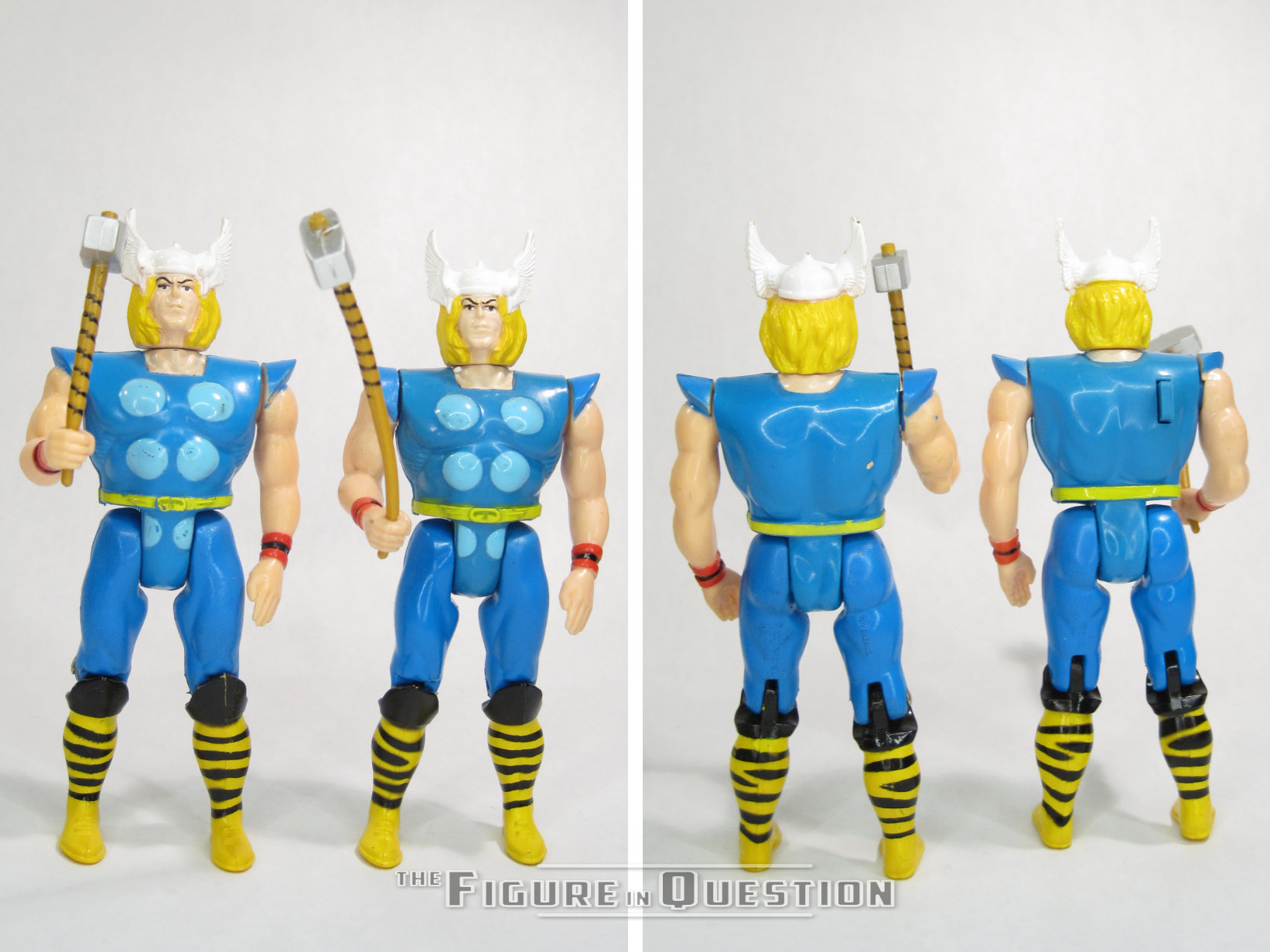 I think my actual review on this guy was generally solid. He’s got some issues that hold him back from being great, but in the larger context of Marvel Super Heroes, he works well enough. What I was missing at the time were his accessories. I called out the missing hammer, but neglected to mention that he also included a lightning bolt piece. I have subsequently located replacements for mine, and along the way also determined that there were actually two lengths of hammer for this figure, one long, and one short. There also exist two different molds of this release, one with a button for his hammer throwing feature, and one without. Now I have both. Hurrah.