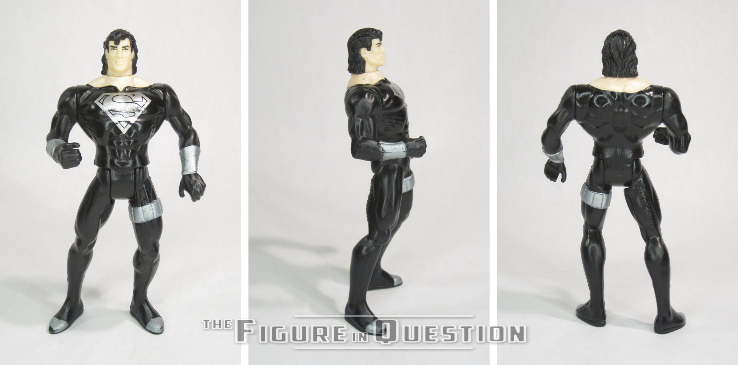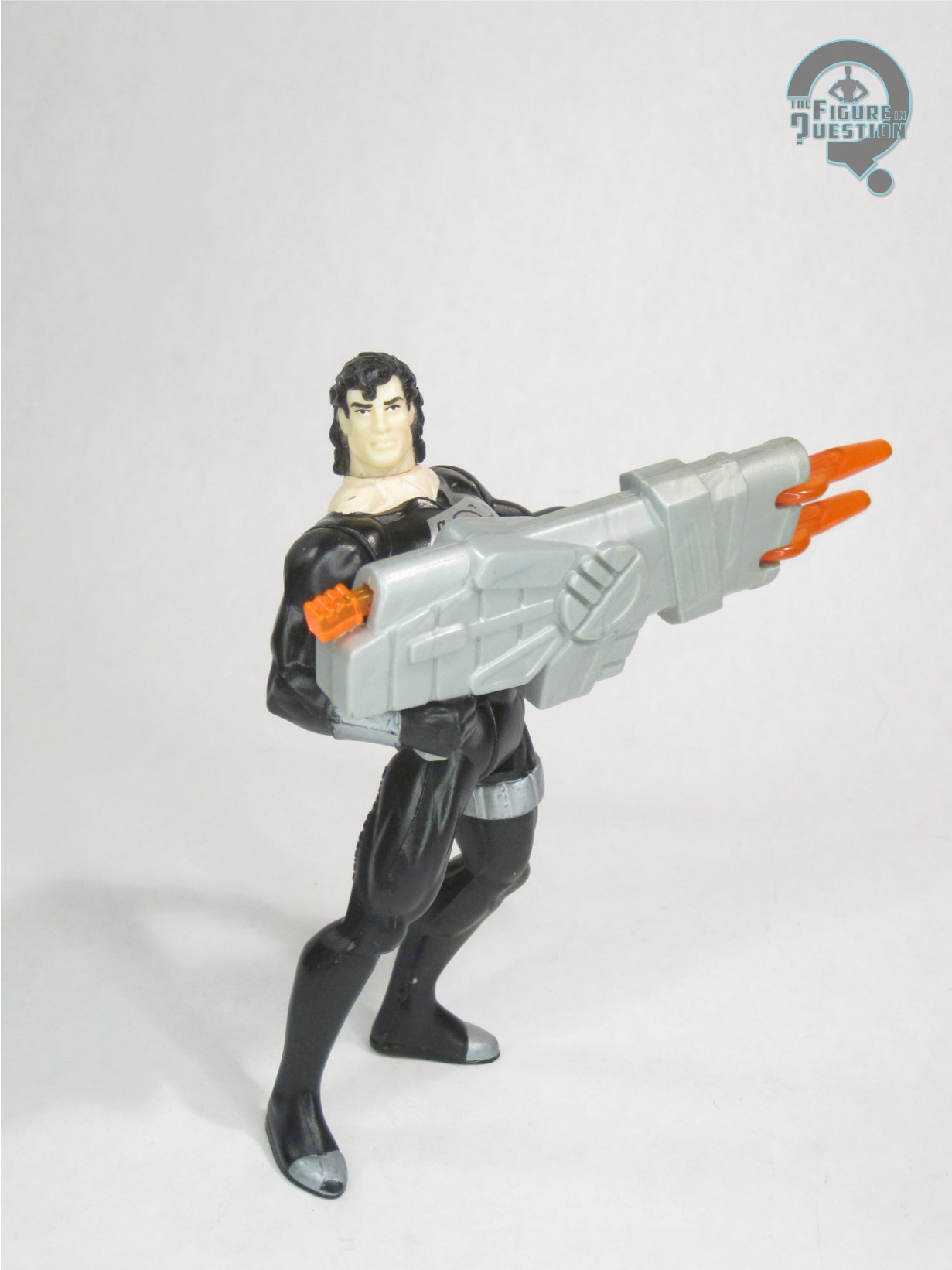 Laser Superman is one of the two Superman variants present in Man of Steel Series 1. He’s the less standard of the two, drawing his look from Superman’s all-black “regeneration suit” from when he came back from the dead. It doesn’t make it past the end of the “Return” story, but it’s a signature look, and nice and distinct from his standard design. The figure stands just under 5 inches tall and he has 5 points of articulation. He gets the basic 5-POA that Kenner was pretty much locked into at this point. It does well enough, though the legs don’t get much range, and he’s not very sure on his feet, so he has a tendency to fall down unless you lean him back. His sculpt was all-new, and honestly not too bad. The head is a good take on the rather dated mullet-sporting Superman look, and would be re-used by a couple of other variants as the line continued. The body’s unique to this figure, and shows some of