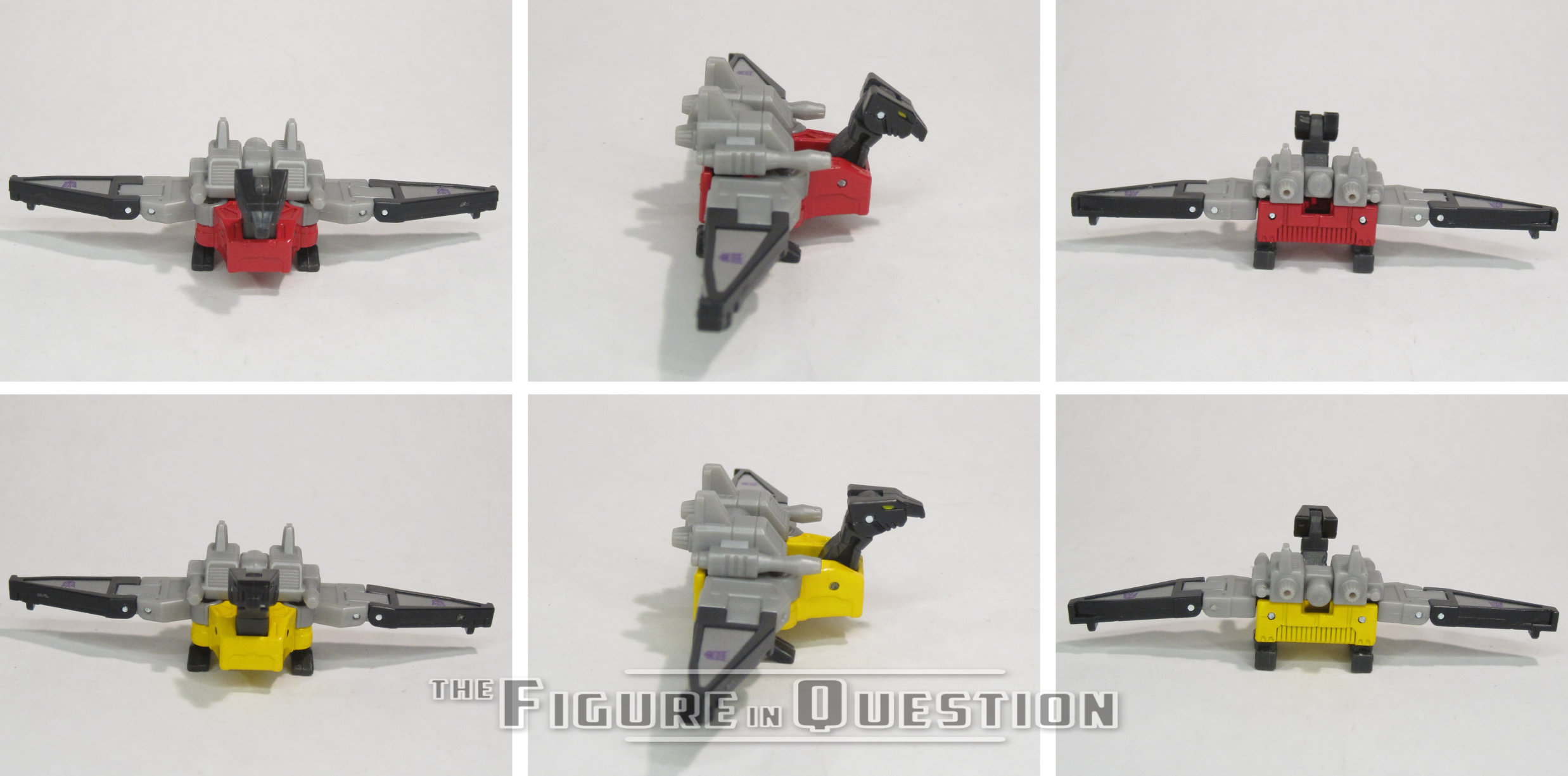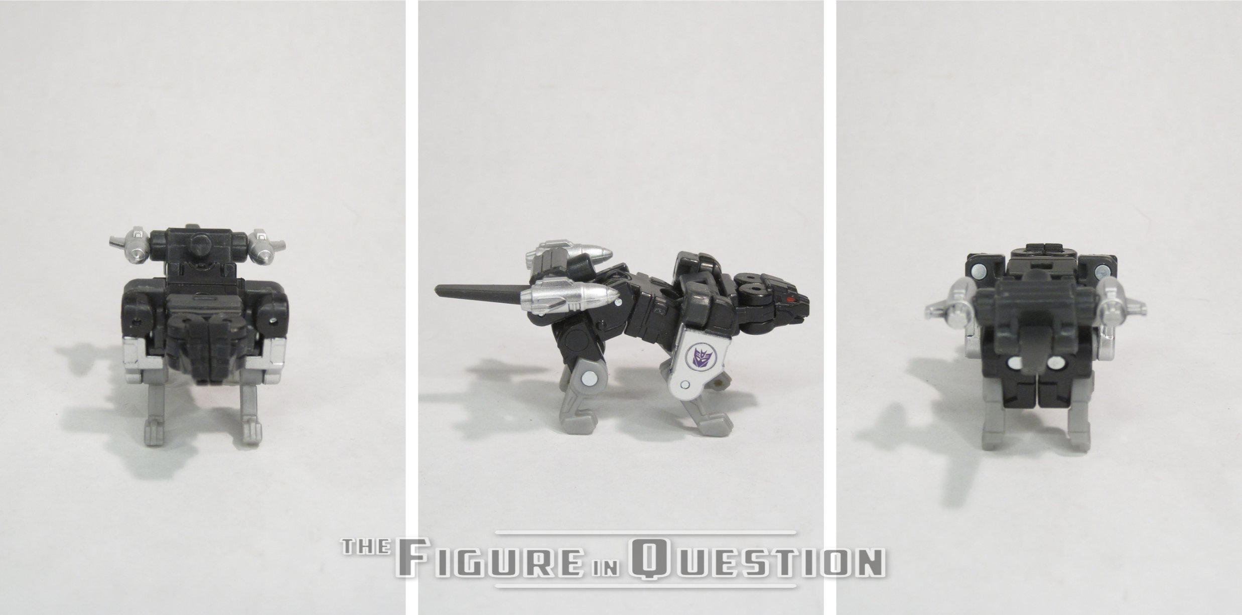 the WFC molds. It’s still compatible with the same size cassettes, though, so he remains compatible with the earlier releases. Since he’s directly based on the ’86 movie, his alt-mode is once more a cassette player. The transformation scheme isn’t too terribly different than the Netflix mold, nor is the size of the final product. There are a few more panels that fold out to cover things up, resulting in a look that’s a little bit cleaner. It’s still kind of off when viewed from any angle but the front, but it’s not as bad as the earlier look. Soundwave’s color work is another change-up, as this one favors flatter finishes than the metallic look of earlier releases. I do generally like it, and it’s still a little bit more metallic than, say, the RED or Super 7 releases, but it’s certainly closer to the animation. Mine has a notable spot on his mouth guard, which is annoying, but otherwise the coverage isn’t bad. Soundwave is packed with his usual shoulder cannon and handblaster. The blaster can collapse, again like the usual. He is also packed with new versions of Ravage, Laserbeak, and Buzzsaw. They’re all-new molds, though, obviously, Laserbeak and Buzzsaw share the same mold. The bird mold is decent, but perhaps a bit underposable in bird mode. I actually quite like the Ravage mold, which surprised me, because I’m usual not very impressed by Ravages.