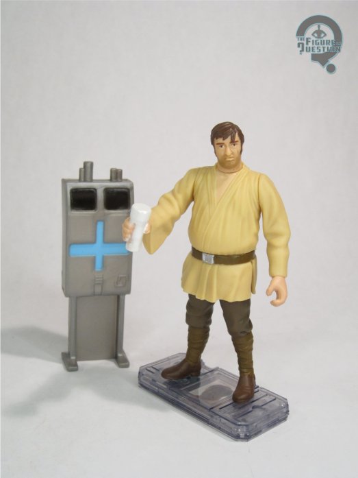 passing resemblance to actor Ted Burnett, who played Wuher in the film, and he’s got that appropriate slack jawed sort of sneering look he had during his one bit of dialogue. The body sculpt is on par with earlier offerings from the line, so it’s basic, but it works. Perhaps the oddest quirk about it is that the glass in his right hand is permanently molded there, which is an odd choice to say the least. The 2004 release would alter the mold to him a more normal hand. The color work here is, much like the sculpt, rather basic, but there’s some more intricate work on the face, which makes him appropriately scruffy. The glass is once again an issue, with some rather obscenely sloppy paint around the edges on that one. Wuher is packed with his droid detector unit (for all of his racist needs), which is a neat enough piece, albeit hollow on the back side, as well as a CommTech stand.
