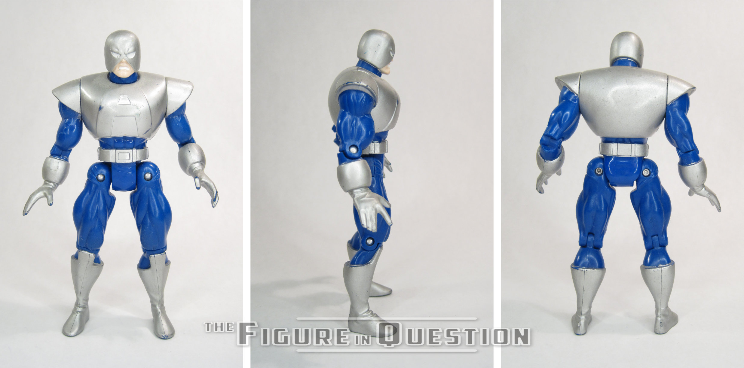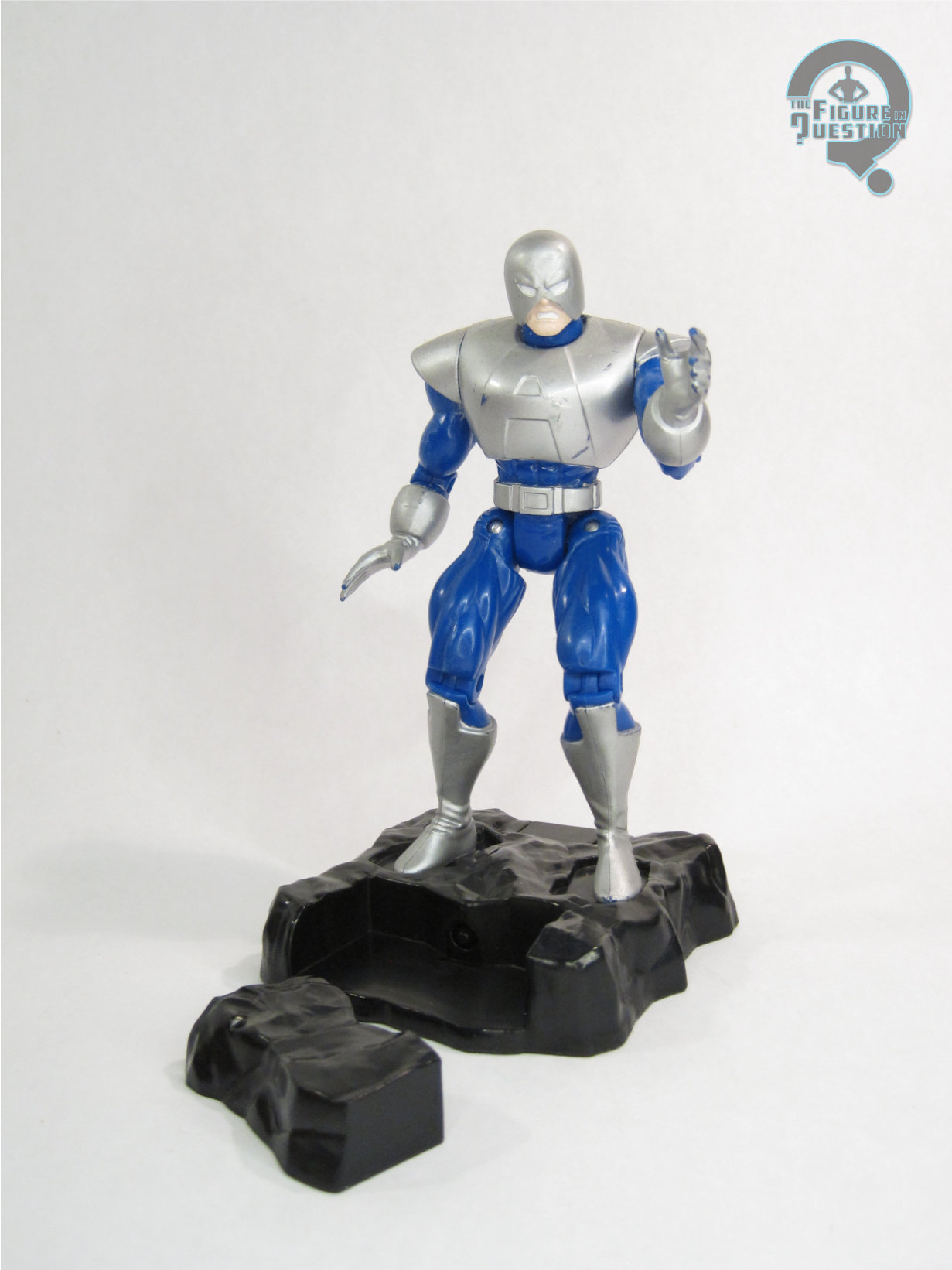 Avalanche was released in Series 5 of Toy Biz’s X-Force toyline. He was the second of the Brotherhood of Evil Mutants figures featured in this particular line, following Pyro. Seeing how the two of them were a semi-recurrent pair on X-Men: The Animated Series, it was a pretty sensible inclusion, I suppose. The figure stands 5 1/2 inches tall and he has 11 points of articulation. He got extra disk joints on his hips, which I guess was kind of nice. It does seem a little bit odd that Avalanche of all people got extra special articulation, but I’m not gonna fight it. HIs sculpt was all new to this particular figure, and it was fairly decent for the era. The proportions are a little exaggerated, obviously, but given that he was in the X-Force line, it’s actually fairly balanced. There articulation could perhaps be worked in a bit better, but it’s not awful. The details of the costume are pretty clean, and I do like the intensity of the expression on what we can see of his face. It’s a bit of a shame that his helmet is permanently affixed, since he had it off rather frequently on the cartoon, but it looks good, and that’s ultimately the most important thing. Avalanche’s paintwork is fairly standard, mostly silver and blue. It looks decent enough, though it’s perhaps not the most thrilling color scheme. Avalanche was originally packed with an “Exploding Rock Platform” which demonstrated his powers via action feature. My figure was purchased loose, however, so he doesn’t include this piece.