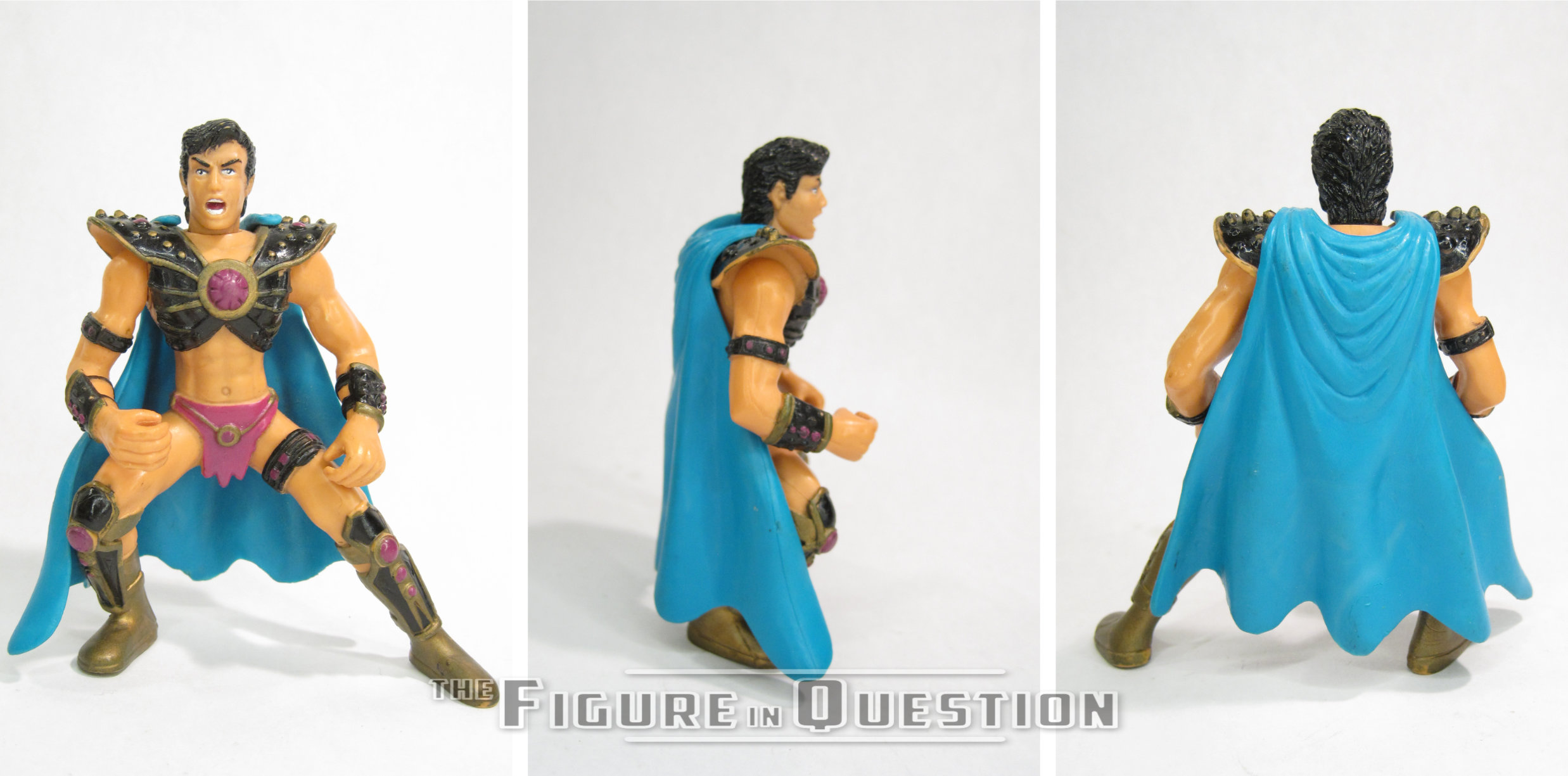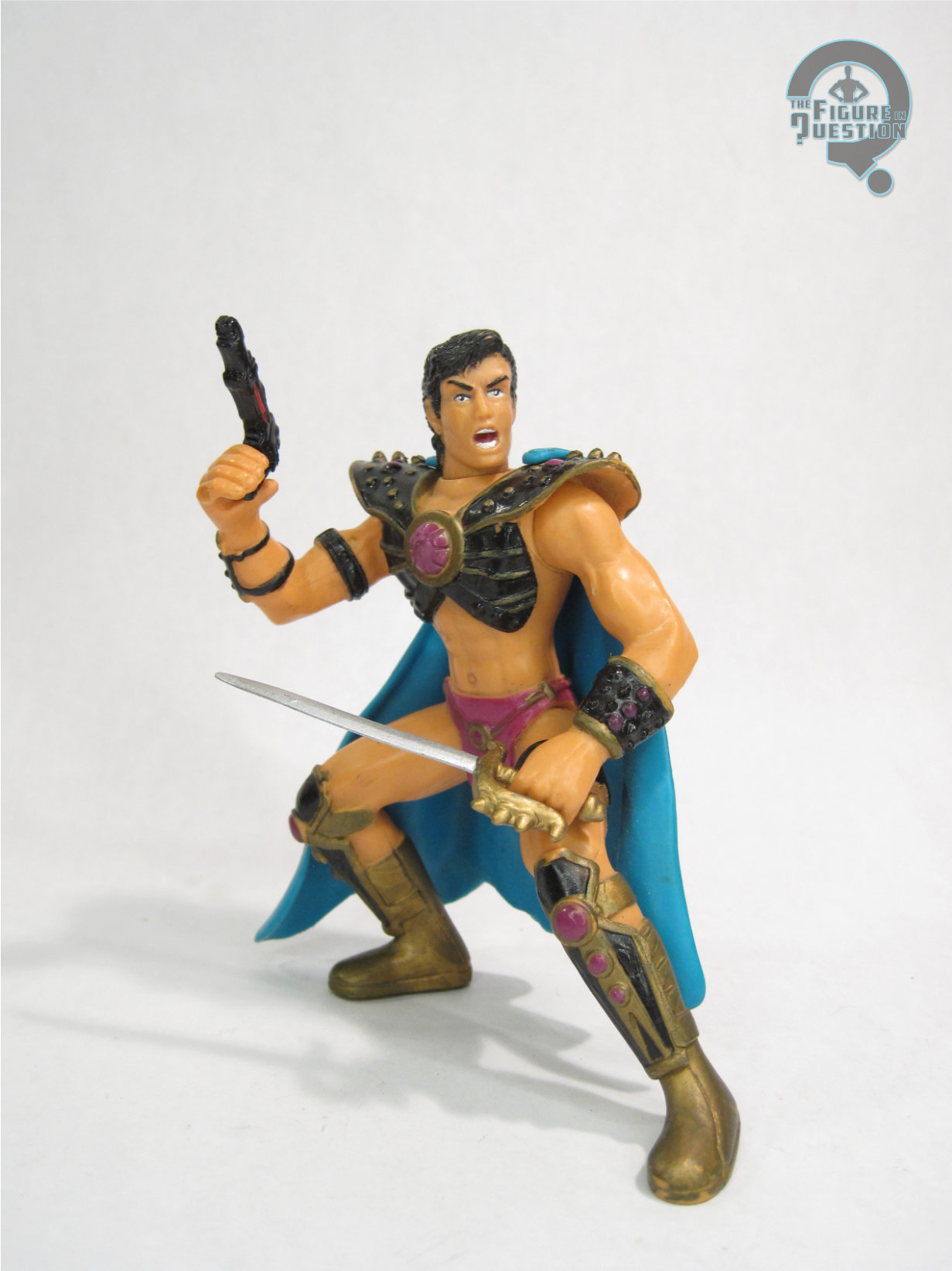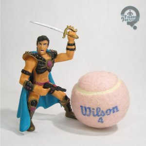 John Carter was released as part of Trendmasters’ 1995 Tarzan: The Epic Adventures line, specifically under its “Conqueror of Mars” sub-line.  He was available one of three ways.  First, as part of a two-pack with the Thark O Mad Zad, then in a larger nine figure boxed set, and then finally alongside his wife Deja Thoris.  The figure stands (or crouches, anyway) 3 1/2 inches tall and he has 3 points of articulation.  Movement is limited to swivels at the neck and both shoulders.  None of the joints are fully unobstructed, especially the shoulders, but there’s a bit of variety to be had nonetheless.  The sculpt to this guy is unique.  He’s sporting some intricate armor, which is a little larger and more involved than we usually see John in, but it’s also not totally out of place.  He’s incredibly pre-posed, to the point that a Total Justice figure looks tame.  He’s got a very serious deep lunge going on.  All of that pre-posing makes the exact proportions of John seem…off?  The arms are most certainly too long for the rest of the body, but at least they’re bent at the elbows, so as to better hide it.  His head is a reasonable enough rendition of John.  The scream is kind of an odd choice, as that’s more of a Tarzan thing, but it works in a sort of action oriented sense.  John’s color work feels pretty true to the illustrations of the character.  He’s kind of orange, but less-so than Deja Thoris, suggesting it’s just from all the time he’s spent on the red planet.  John was packed with a sword and small pistol, allowing for him to really get into that action-oriented orientation.  For action.