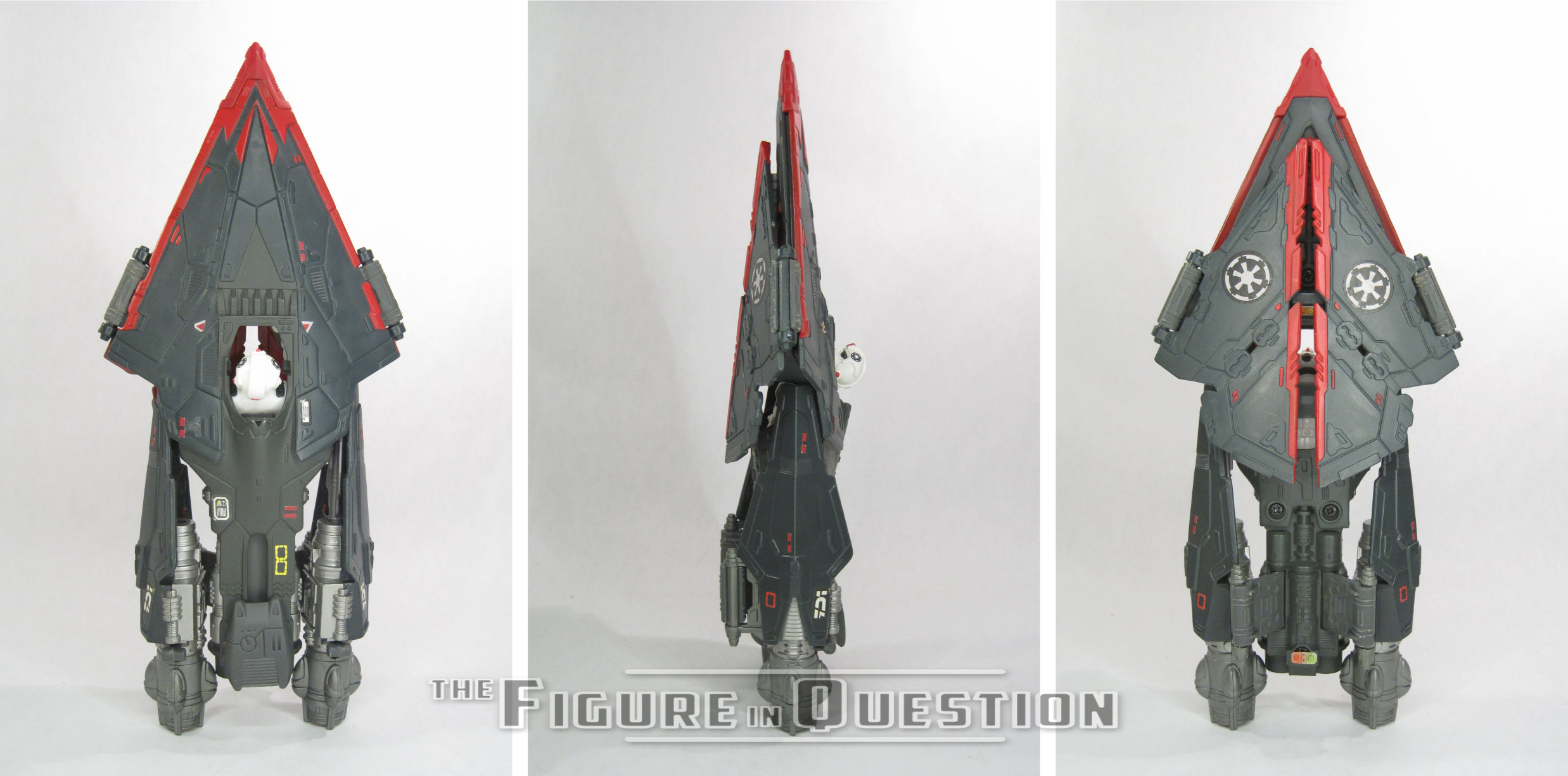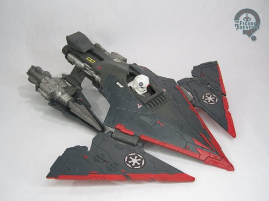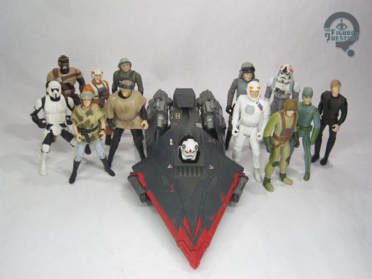 a Star Destroyer got ‘90s-ized…which I suppose is fairly accurate. There’s a lot of panelling and grates. I don’t know that it *quite* lands the Imperial aesthetic, but it wouldn’t look entirely out of place with prequel era offerings. You can fold out the back to reveal a pair of missile launchers, while the front flaps fold out from underneath to form wings. Pushing back the slide towards the back pulls back the “hood”, allowing the spring-loaded trooper to pop his head up. This was a gimmick that Kenner was fond of in ’97, offering a similarly-styled set of vehicles in their Batman & Robin tie-in line. Color-wise, the vehicle is a lot of grey and silver, with some red thrown in for a bit of pop. There were a fair number of decals, which kept it consistent in styling with the other vehicles of the time. The Trooper is painted, albeit very basically, and is mostly white, which is a good contrast from the TIE Pilots. The set included two missiles, but no other extras to speak of.