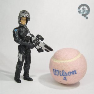 Major Don West was released in 1998 as part of the one and only basic figure series for Trendmasters’ Lost in Space movie tie-in line. Don is based on his “space suit” look (if you can really call it that) from the sequence onboard the derelict ship, which was where most of the marketing push came from. The figure stands about 4 1/2 inches tall and he has 6 points of articulation. Trendmasters was definitely taking a page out of the Kenner playbook on this line, in terms of scaling, articulation, and overall style. Unfortunately, they kind of missed the mark on the style part. The sculpt is unique to this figure, and that’s good, because it avoids letting this sculpt infect any other figures. It’s…well, it’s not great. The head sculpt is supposed to be Matt LeBlanc, but it looks more like Joe Pesci. The proportions are a mess, with the head and hands much larger than they should be relative to the figure’s very scrawny body. He’s sort of pre-posed, but like half-heartedly so, so he’s just awkward looking. Awkward.