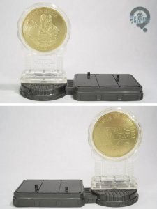 radically different paint scheme, though! ….Nah, I’m just kidding. What he actually gets is almost the exact same paint scheme, but now there’s some additional grey drybrushing on some of the fur. Is it worth it? No, not really. You’d probably miss it if you didn’t have both versions on hand. But it’s different? So, yay? Chewbacca is packed with the standard bowcaster from the first release (but lacks the wonky blaster rifle), as well as the display stand and Millennium Minted Coin. That’s where the oodles of fun comes in.