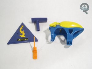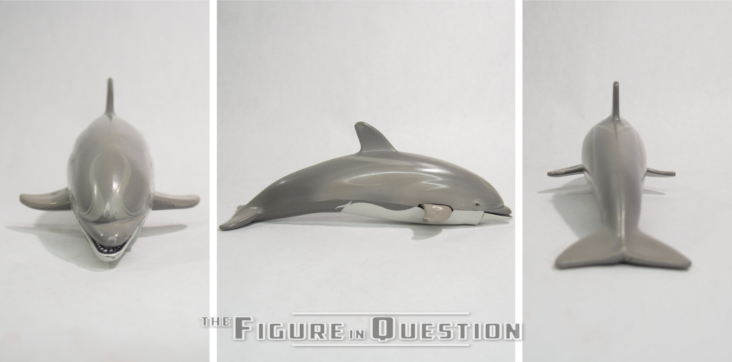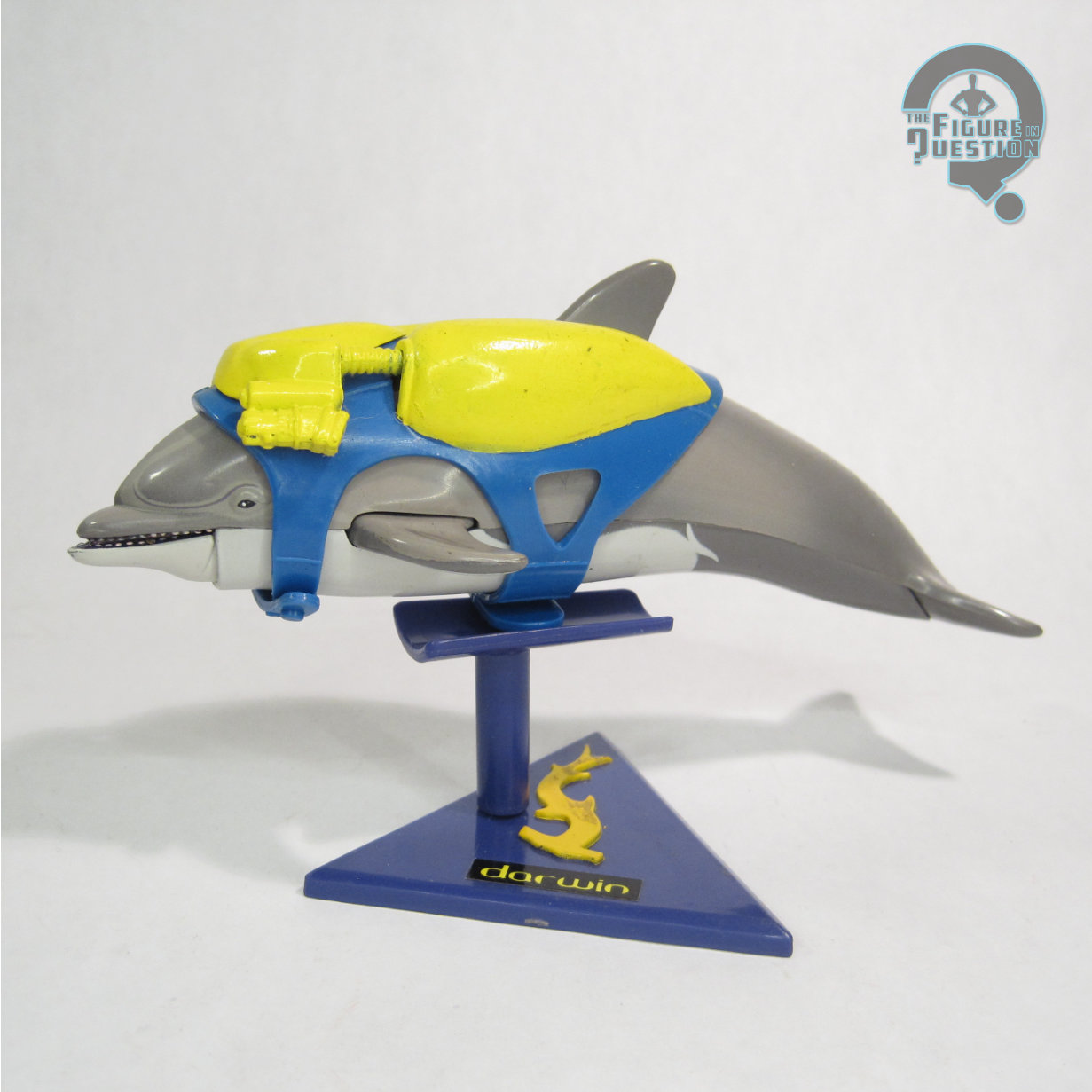 Darwin was released in 1993, as part of Playmates one and only SeaQuest DSV tie-in assortment.  Darwin was actually short packed at the time of release, which, coupled with his popularity, made the figure quit a hot commodity for a while.  The figure is about 5 inches long and, while he doesn’t have articulation in a traditional sense, he does have some points of movement.  His two pectoral fins are able to be pushed inwards, which opens his mouth, and emits a squeaking sound, sort of as if he’s “talking.”  Darwin’s sculpt was all-new and unique to him.  Obviously, as a dolphin, he’s rather a departure from the established style.  He’s a pretty good recreation of a bottlenose dolphin, and specifically looks accurate to the models of Darwin we saw on the show.  He’s in a rather basic pose, and sculpting is fairly clean.  There’s kind of an ugly joint where the mouth is meant to open, but it’s on the underside mostly, so not crazy visible.  Darwin’s paint work is honestly more involved than you might expect, with all the proper color variation on his skin, plus fully painted interiors on his mouth.  For a line of this scale and style, that’s generally pretty rare, so the extra effort’s appreciated.  Darwin was packed with his Dolphin Rebreather, a rather sizable overlay piece, which attaches quite securely to the figure, and gives him a more distinctive flair.  He also includes a vocoder, sonar tag (missing from my figure), and display base with a special attachment to hold him in place horizontally.