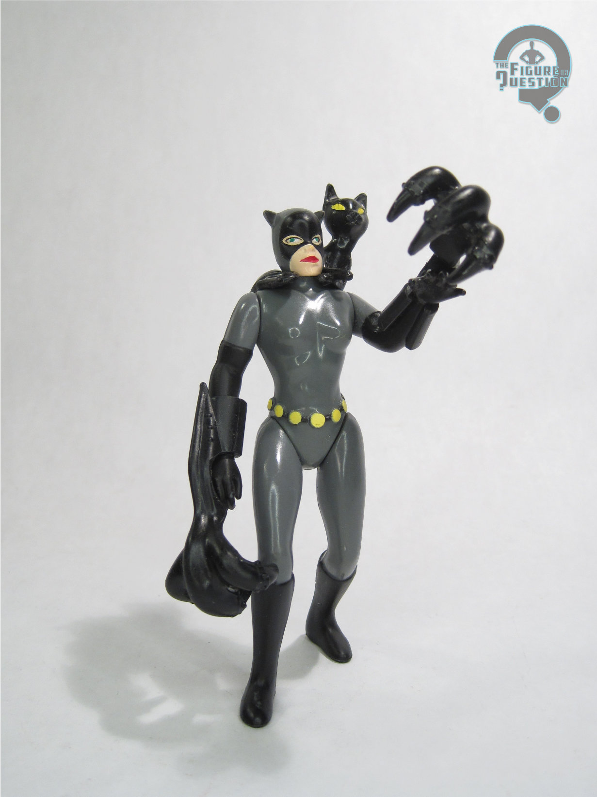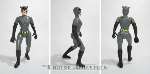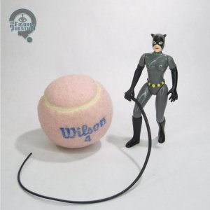 Catwoman was, like last week’s Robin, released in the 2001 “Revenge of the Penguin” boxed set, under Hasbro’s wider Batman banner. She’s effectively just a re-release of Kenner’s original Animated tie-in figure from 1992, and she would see an additional (and truly identical) release from Hasbro in 2003’s “Girls of Gotham City” boxed set. The figure stands 4 1/4 inches tall and has 5 points of articulation…or close to it. She’s got a spring-loaded feature in her right shoulder, which brings it back down when you raise it, meant for use in conjunction with her included whip. While visually unobtrusive, it means the shoulder doesn’t actually hold any poses, which is a bit of a bummer. Beyond that, she’s got v-hips, which are never my favorite, and result in the figure being rather hard to pose. The sculpt is the one originated by Kenner in 1992, and it’s…fine. It’s not bad, but it’s a little more pre-posed than other figures from the same line, a little hard to get standing, and also she’s got a