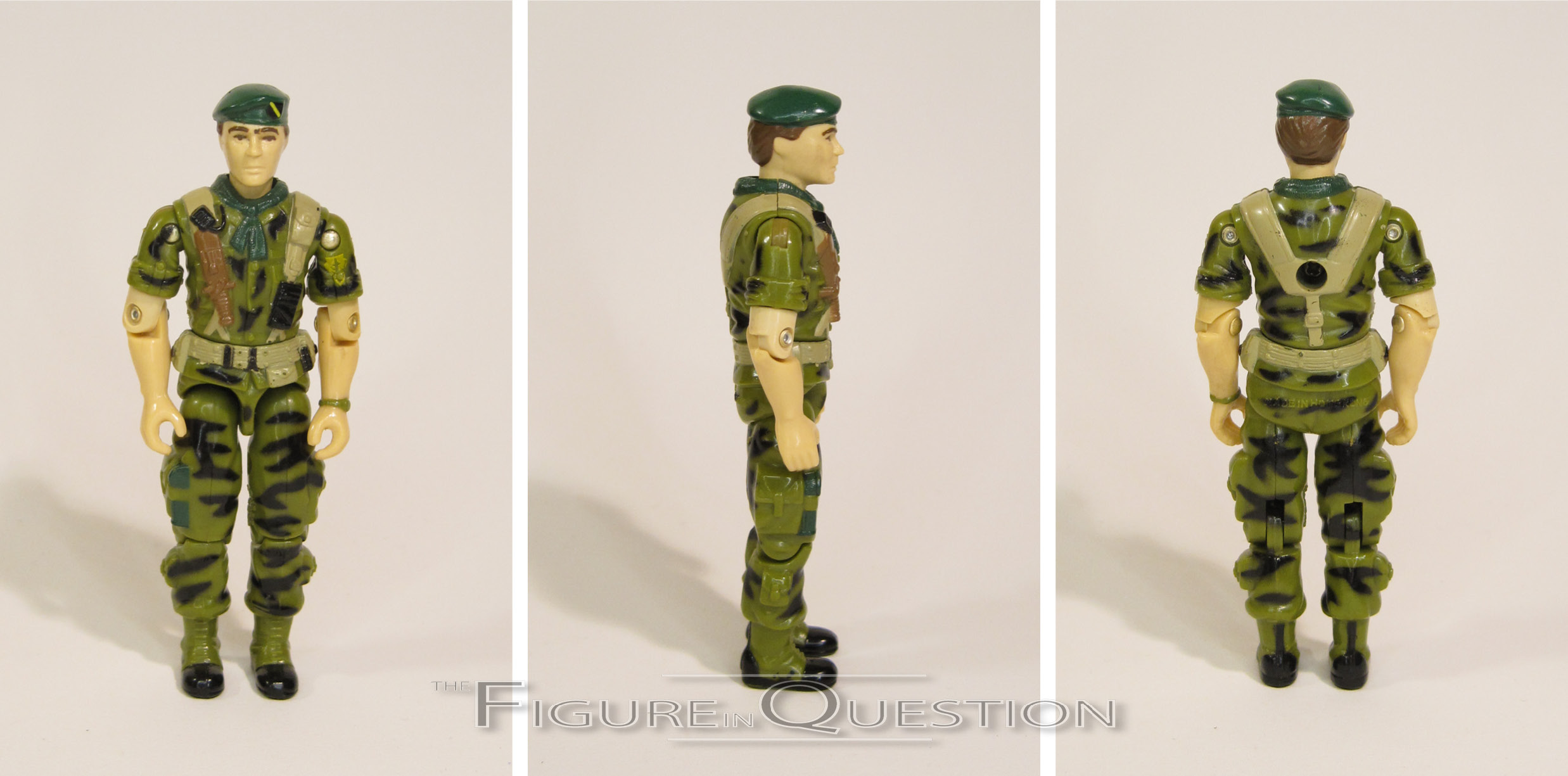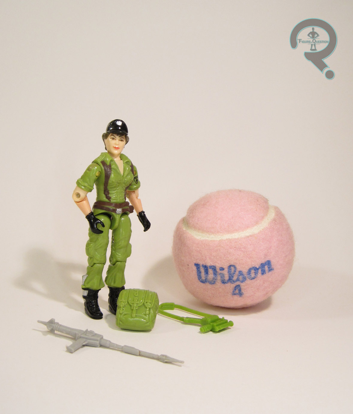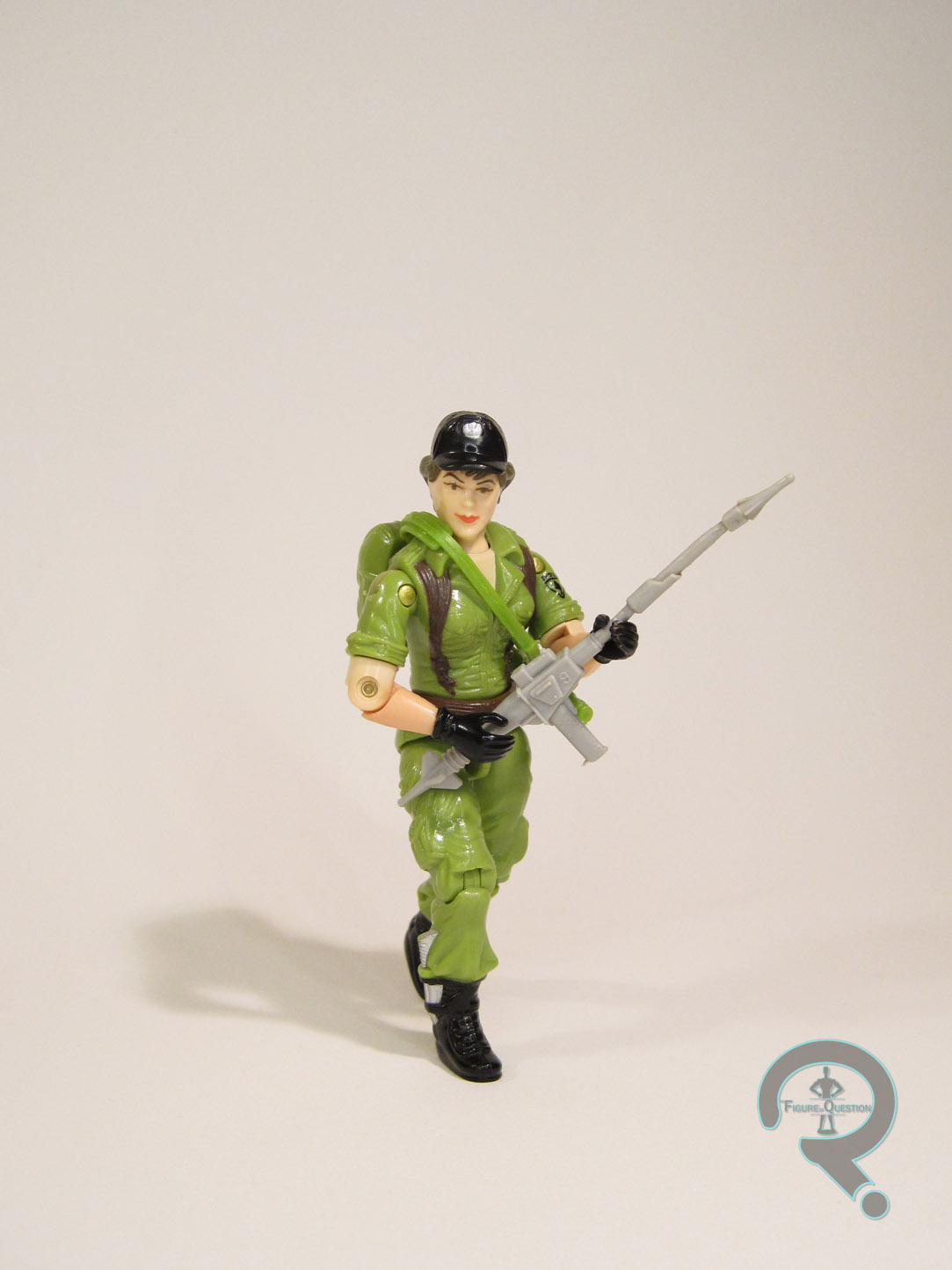 removeable beret to look as good as it does. Flint’s body is pretty solid work, too, with detailing that’s generally just a little sharper than Series 1’s Duke; I especially like the raised collar piece, as it adds a fair bit of depth. Flint’s color work is decent enough. He’s got the proper animation colors, so his shirt’s the same olive green as the pants, offset by brown for the camo pattern and his accent pieces. While the first series gave painted skin to Duke, Flint and Lady Jaye both get molded plastic skin, which has its pluses and minuses. The paint’s definitely the best on the head with the removable beret; something about the eyebrows on the other two seems off. Also, the one with the headset has a big spot of red paint on the back of his beret on my copy, which is rather annoying. Flint is packed with 8 hands (a pair of fists, a pair of loose grip, a pair of tight grip, and pointing and closed grip for the left hand), binoculars, a radio, a flashlight, a shovel, a newspaper, a back pack, a standard laser rifle, a pistol, and Flint’s usual shotgun.