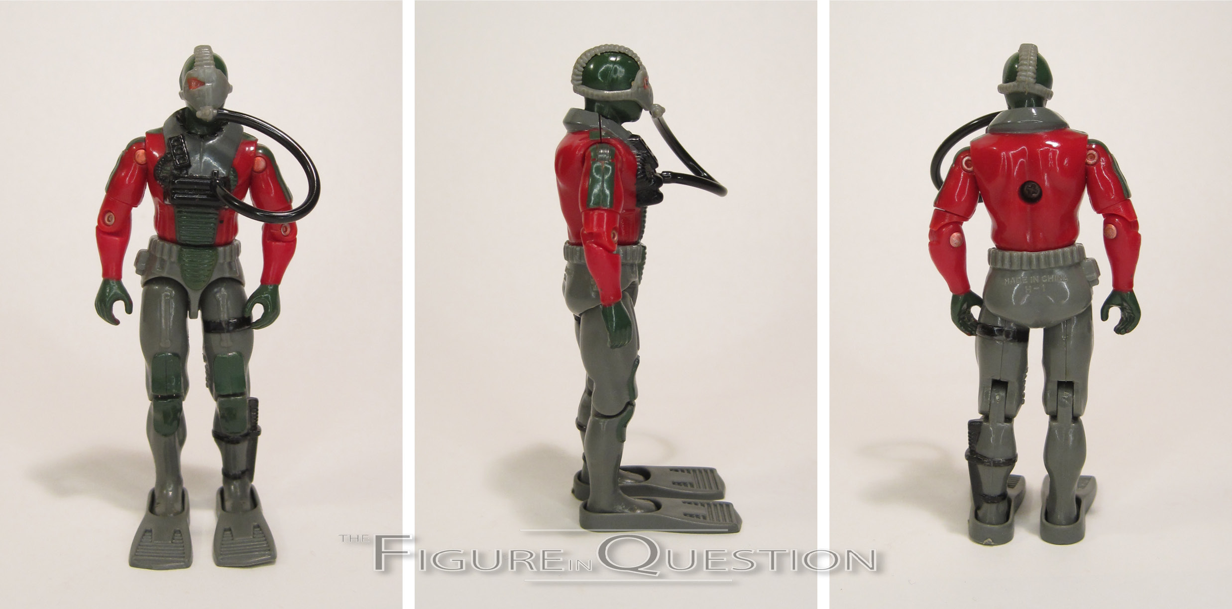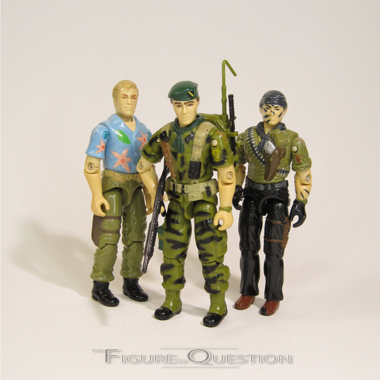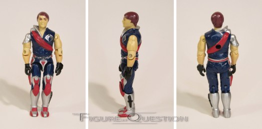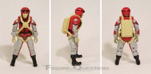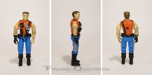 removeable beret to look as good as it does. Flint’s body is pretty solid work, too, with detailing that’s generally just a little sharper than Series 1’s Duke; I especially like the raised collar piece, as it adds a fair bit of depth. Flint’s color work is decent enough. He’s got the proper animation colors, so his shirt’s the same olive green as the pants, offset by brown for the camo pattern and his accent pieces. While the first series gave painted skin to Duke, Flint and Lady Jaye both get molded plastic skin, which has its pluses and minuses. The paint’s definitely the best on the head with the removable beret; something about the eyebrows on the other two seems off. Also, the one with the headset has a big spot of red paint on the back of his beret on my copy, which is rather annoying. Flint is packed with 8 hands (a pair of fists, a pair of loose grip, a pair of tight grip, and pointing and closed grip for the left hand), binoculars, a radio, a flashlight, a shovel, a newspaper, a back pack, a standard laser rifle, a pistol, and Flint’s usual shotgun.