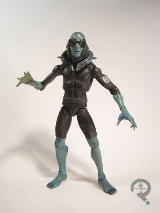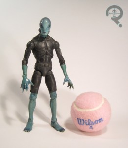 Abe Sapien was released as part of the single-carded first assortment of Super 7’s Hellboy ReAction Figures line, alongside HB, Liz, and Lobster Johnson. The figures are all comic-based, filtered, of course, through the usual ReAction lens. The figure stands 3 3/4 inches tall and he has 5 points of articulation. His sculpt was unique to him, and it does a respectable job of taking Mignola’s fish-man design and making it look like a Kenner figure from the ’70s. Proportionally, his head seems maybe a bit big, but I think that may also be slightly linked to the way the gills work. Beyond that, it’s a neat sculpt. They’ve gone more for the “underwater adventure” look for Abe, so he’s got his shorts and belt, but that’s it. The feet are an interesting quirk; as far as I know, Abe’s always been depicted with actual toes, albeit frequently webbed ones, but this figure gives him sort of hooves, kind of like what Hellboy classically has. I’d chalk it up to shared parts, but the two have very different details elsewhere on their legs, so it can’t really be that. Just one of those things, maybe to sell the frequent Kenner inaccuracies? The color work on Abe is pretty fun; the teal sort of color is brighter than Abe is usually depicted, but it fits the vibe of the line very well, so I very much dig it. Application’s all pretty clean, and there’s a surprising amount of accenting. Abe is packed with a harpoon, which is great for all those harpooning needs.