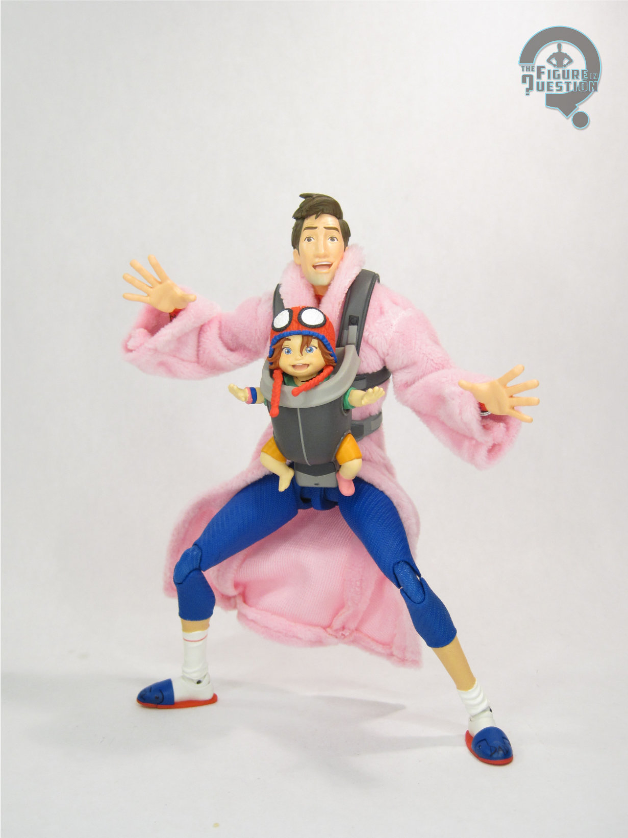 ensemble: the pink bathrobe. It’s quite a statement piece and neat counterpoint to his green jacket from Into. Here, it’s a soft goods piece, which makes a lot of sense. It’s very soft and fuzzy, and there’s a wire in it for dynamic posing. Peter’s paint work is all pretty top-notch. The work on the unmasked heads is by far the best, but even the suit is clean and well-rendered. As mentioned above, Peter gets all the parts for both of his looks, as well as six pairs of hands (four gloved in fists, thwipping, gripping, and open gesture, two ungloved in open gesture and relaxed), the wrist bracelet goober thingy, and three different weblines. The weblines are ultimately a bit unimpressive compared to others we’ve seen, but I don’t see myself using them anyway. The most important selection of extras is Mayday and her associated parts. The main Mayday is done up in a crawling pose, and is jointed at the neck and waist. While the arms and legs are separate, they have rectangular pegs, so they can’t be posed, which is kind of a shame. She does get two heads, so you can do with or without the hat. Why you’d leave off the hat is anyone’s guess, but the option’s there. Also included is the carrier for Mayday, which can be attached to the main Peter figure. There’s a special neck piece that goes in that one of the two heads can be attached to (the hat fits better than the one without), and you can move the arms and legs over as well. It stays on pretty securely, and scales well to the other figure. It’s also relentlessly adorable.