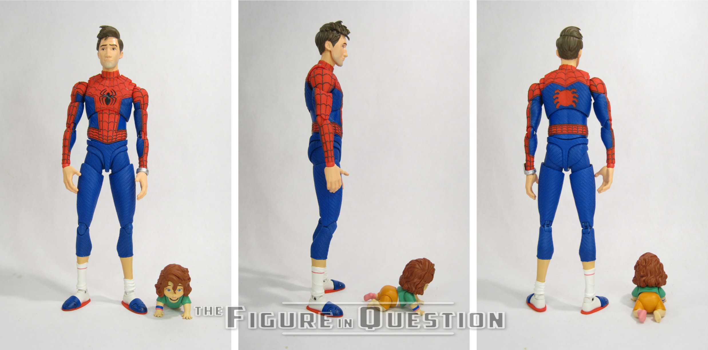The two Spider-Verse films we’ve gotten thus far have both had a lot of importance placed on growth of characters and definitively moving them forward in their own narratives. In a world of super hero movies that change the main heroes’ costumes purely for the sake of change, it’s nice to see an approach that works those changes more into the story, and how it affects the characters. Into the Spider-Verse showcases a Peter Parker at his lowest point. He’s alone, out of shape, and disheveled, and spends a good portion of the film in a makeshift outfit that further emphasizes that. Across re-introduces us to Peter as he’s well into his way of recovering, and he’s so not alone that he’s literally got another person strapped to his chest for most of his screen time! Despite him being more on the mark and put together this time around, Peter B. Parker was surprisingly absent from the toy coverage for Across, with most of his figures actually being repurposed looks from the first movie. He got a Pop, which is great if you like Pops, but then it was a rather long wait for a proper figure. Bandai ultimately took the lead this time, with a figure from their SH Figurarts line, which I’m taking a look at today!