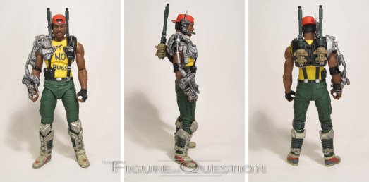 Sgt. Apone is one of the three figures in the Kenner-inspired Series 13 of Aliens from NECA. The figure stands 7 inches tall and he has 22 points of articulation. As I noted when I reviewed the original Kenner Apone, his design from Kenner was perhaps one of the most divergent from the source material. Gone was his uniform and standard military gear, replaced by something I can only describe as “uber ’90s”. He’s got a backwards baseball cap, fingerless gloves, a bright-colored t-shirt with the sleeves torn off, and even a pair of sneakers inspired by the ones Ripley has in the film (which her Kenner figure didn’t have; I can only imagine that Al stole them from her). The look is unique to say the least. For the part of this specific figure, he’s done a pretty amazing job of faithfully capturing the details of the original figure, while still updating him so that he won’t look *too* out of place with the rest of the movie-inspired figures. There’s a lot of great small detail work going on, from the wrinkles of his pants, to all the little stitches and wear on his boots. The facial likeness is a tricky area of course, since it’s not officially an Al Matthews likeness, same as the Kenner figure before it. But, like the Kenner figure, it’s still got a more than passing resemblance to the guy, meaning he still looks like Apone. For the more resourceful customizers out there, I can see this head leading to a pretty easy movie accurate version of the character. If there’s one drawback to the sculpt, it’s the way the cybernetic arm impedes the articulation on his right elbow. It’s not terrible, and you can still get some good poses, but it’s not as good as the left. In NECA’s defense, the original Kenner figure threw the arm on with no intention to articulate it, so they’re just doing their best to remain faithful to that design. In the end, it’s not that big an issue, but it did somewhat stick out at me. Moving onto the paint, Apone’s got some solid work, and is appropriately garish in color scheme. He’s got his signature “No Bugs” scrawled across his shirt, which definitely looks cool, and as a whole the figure just really pops. What I like the most about it, however, is that NECA didn’t just do the basic colors, they’ve also gone behind and added some accenting work, especially on those boots, so even though he may be bright and painful, he still looks like a real person. Apone includes two “grenades” and a shotgun, just like his old figure. The gun is re-used from one of the Genisys Terminators, but it’s actually a surprisingly good match.