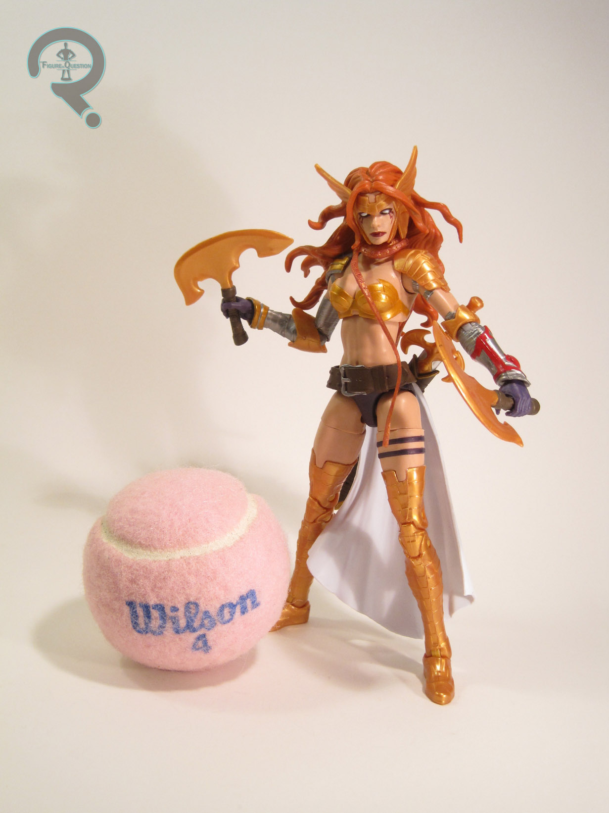 articulation. The head’s actually pretty nice; the face is fairly attractive and fits well with the other Asgardians in terms of basic features, while the hair has a nice, lively flow to it, which makes it look like she’s doing more than just standing there (but it also doesn’t go too overboard, a la the Ultimate Spider-Woman figure). There are add-ons for the belt/loincloth and the…uhhh, scarf? Straps? Neck belt? Leash? I don’t know what that thing around her neck is, but it’s a separate piece. It also kind of sits weird. It’s not really the fault of the figure, but I’m not really a fan of the loincloth’s design. Why is it only at the back? Is it supposed to be some sort of butt cape? I don’t know. I really feel it would look much better if it were also present at the front. As it is, she looks sort of half dressed. I mean, I know she’s already somewhat on the scantily clad side of the spectrum, but that one bit just looks…unfinished. It’s accurate to the comic and everything, so Hasbro’s not to blame, but it bugs me. The piece also has some difficulty sitting properly, which seems to be a trend amongst her add-ons. Angela’s paintwork is generally pretty solid, so that’s good. The colors are all pretty vibrant, and all of the application is nice and clean. There’s no real accent work to speak of, but it actually doesn’t seem that odd here. Most of her artwork has her looking pretty clean, so this is consistent with that. Angela is packed with a sword and a pair of axes. The sword on mine is malformed into that weird wavy shape, but I actually kinda like it. The axes are kind of goofy, but accurate to the comics, so that’s what that is. She also includes the right leg of the Build-A-Figure Titus.