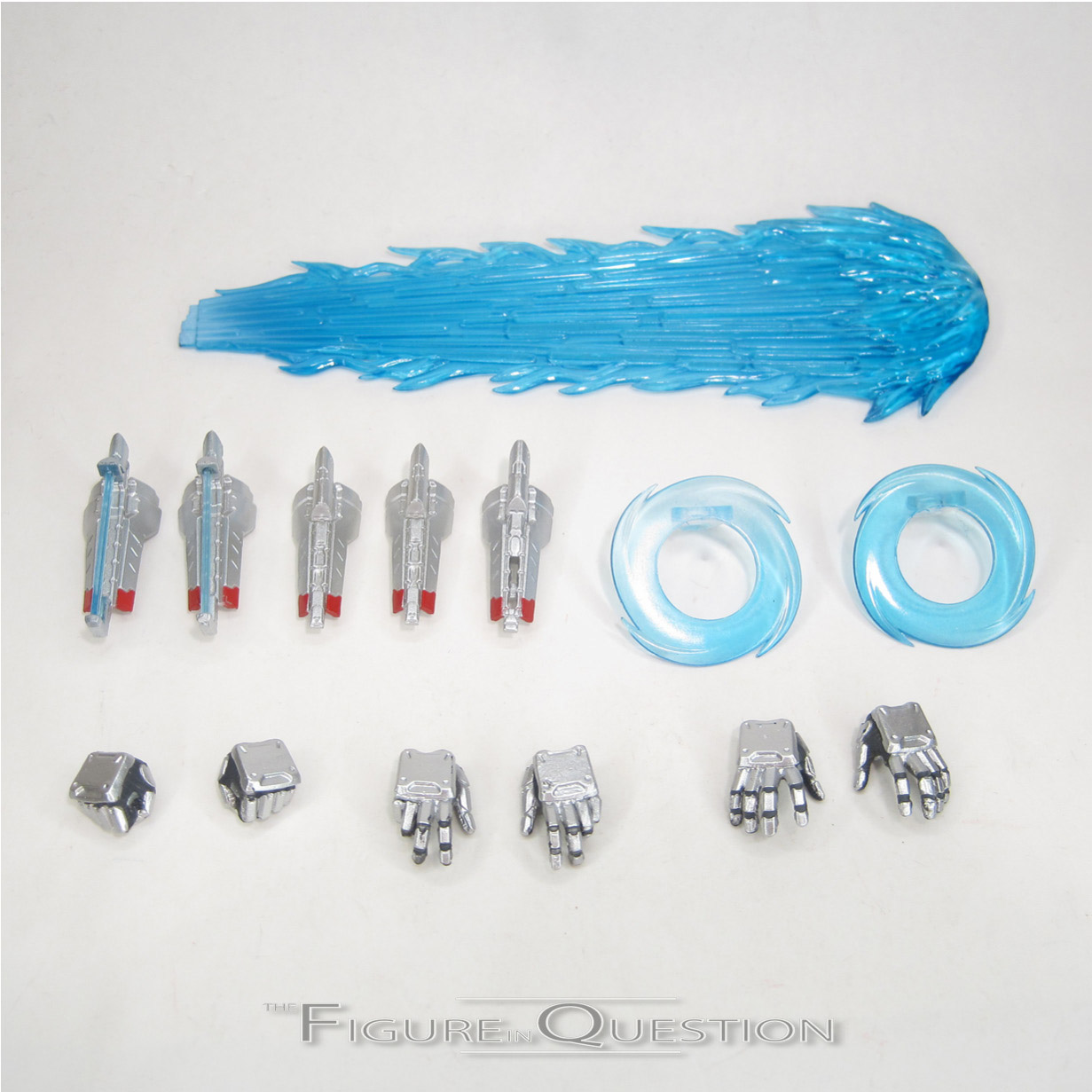 of polish here, and the articulation has been nicely worked in so as not to impede any of that. The figure has a worked in light-up feature, in both the head and torso, which illuminates the eyes and color timer. It’s a nice, fairly consistent light, and definitely gives the figure that extra bit of pop. Accessing the battery compartments is pretty easy, with the top of the head and one of his back plates popping out. Ace’s paint work just adds to the overall slick look of the figure; that candy coating red color looks really sharp, and it adds up nicely with the clean look on the silver sections. The application is all pretty nicely handled, with no real issues with slop or bleed over. Ace is packed with four sets of hands (in fist, relaxed, open gesture, and flat posing), a Specium Blate effect piece that swaps out for his standard wrists, an alternate right arm in cannon formation, alternate extended wrist connectors, and swappable open panels for his arm guards and the thrusters on his back. About the only thing I really think I might like to see extra is a display stand, but that’s not exactly a requirement.