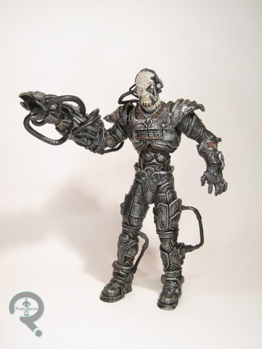 The Klingon Borg, officially designated 1 of 3, was part of the first, and only, series of Art Asylum’s Borg: Assimilation line. The figure stands a whopping 8 inches tall and has 16 points of articulation. He’s a little restricted in terms of movement, but he was fairly decent for the time. The big claim to fame of any Art Asylum figure was sculpting. The Klingon Borg had an all-new sculpt, featuring a tremendous amount of detail work. Every surfaced is covered with some sort of texture or small detail, from the ridges on his forehead, to the machinery of his Borg components. This guy lives up to the Borg’s penchant for asymmetry, with one cybernetic eye, two differently shaped shoulder-pads, and one big honking claw arm to replace his right limb. He loses the usual Klingon dreads, which impacts his design a bit; originally, he was designed with a bevy of cables that would replace the hair, but apparently this made him look too Klingon. As it stands, he’s got just the one big wire, which is a decent halfway point. His face is a good mix of Klingon and Borg sensibilities, with a determined, but still somewhat lifeless stare to his eyes. It’s worth noting that this figure is a fair bit more stylized than many of AA’s Trek offerings, with a more pronounced set of features on his face, slightly exaggerated proportions, and a decidedly slouched pre-posed nature. But, as a concept figure, this guy is more about what could be, outside of the limitations of a live-action sci-fi show’s budget. Though his paint is somewhat monochromatic, it is no less carefully detailed than the sculpt. His cybernetic sections in particular are rife with small detail work, showcasing a variance in silvers, greys, and brasses that keep him from looking too bland, and give him that nice “used future” feel. For accessories, all this guy had was the weird themed coin thing that all of the AA Trek figures got. This one’s red and has the Borg symbol on one side. Not really much to do with the figure, but given the effort that went into the figure’s design and sculpt, the lack of real extras doesn’t hinder him.
