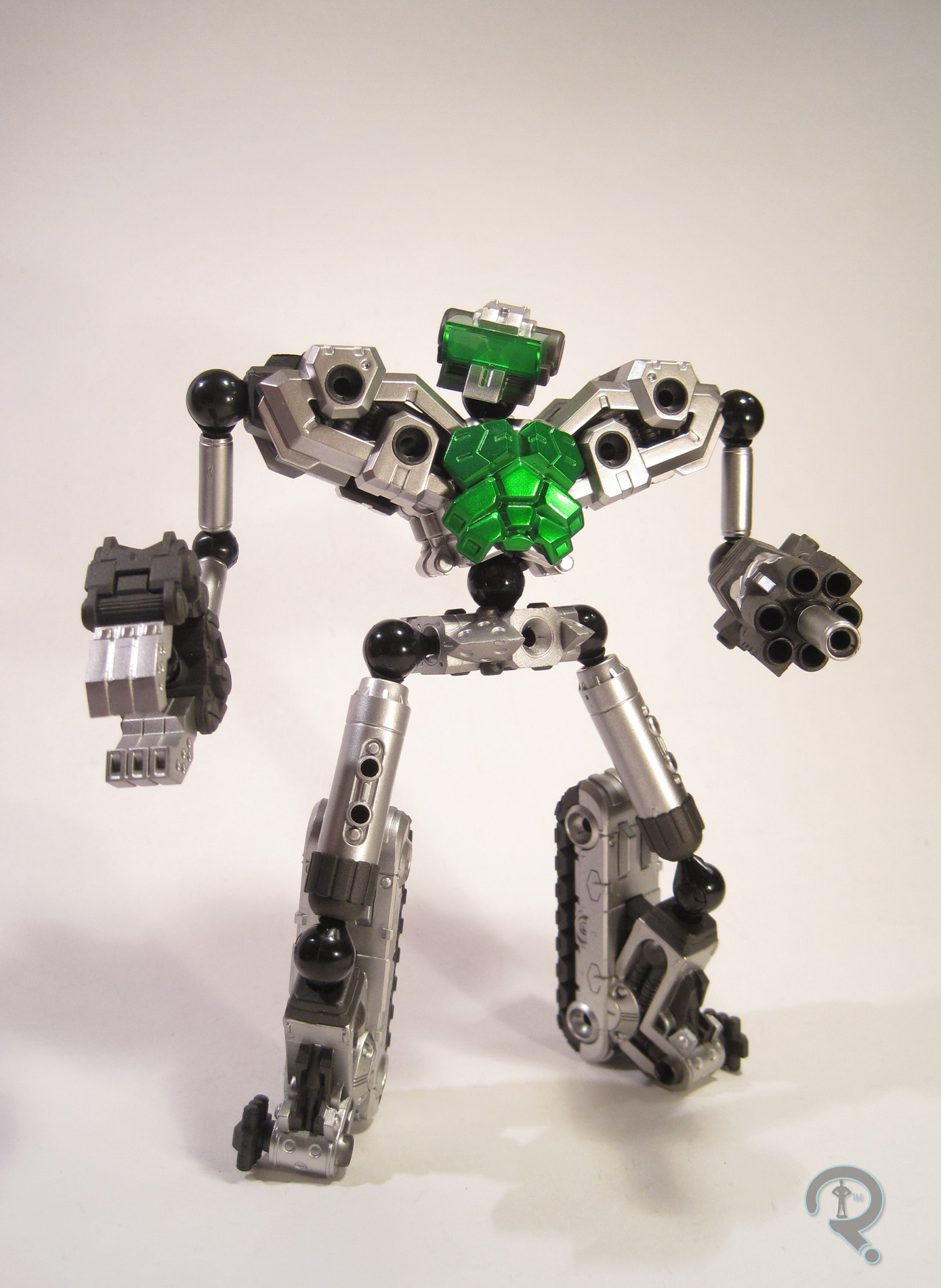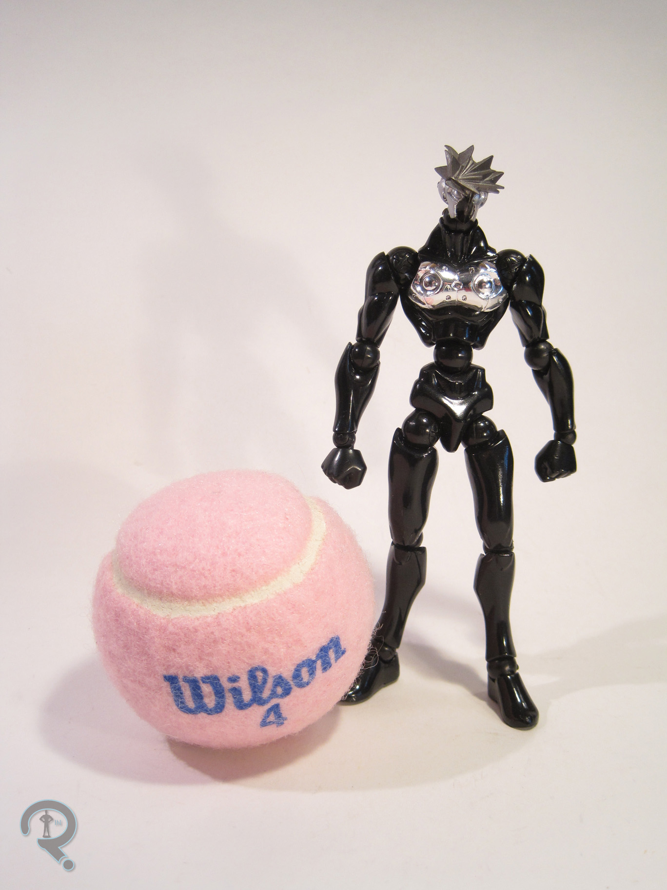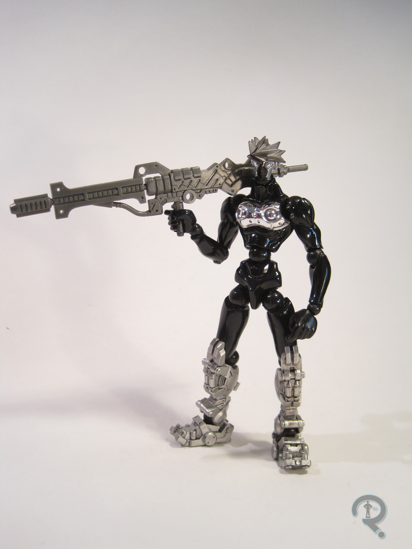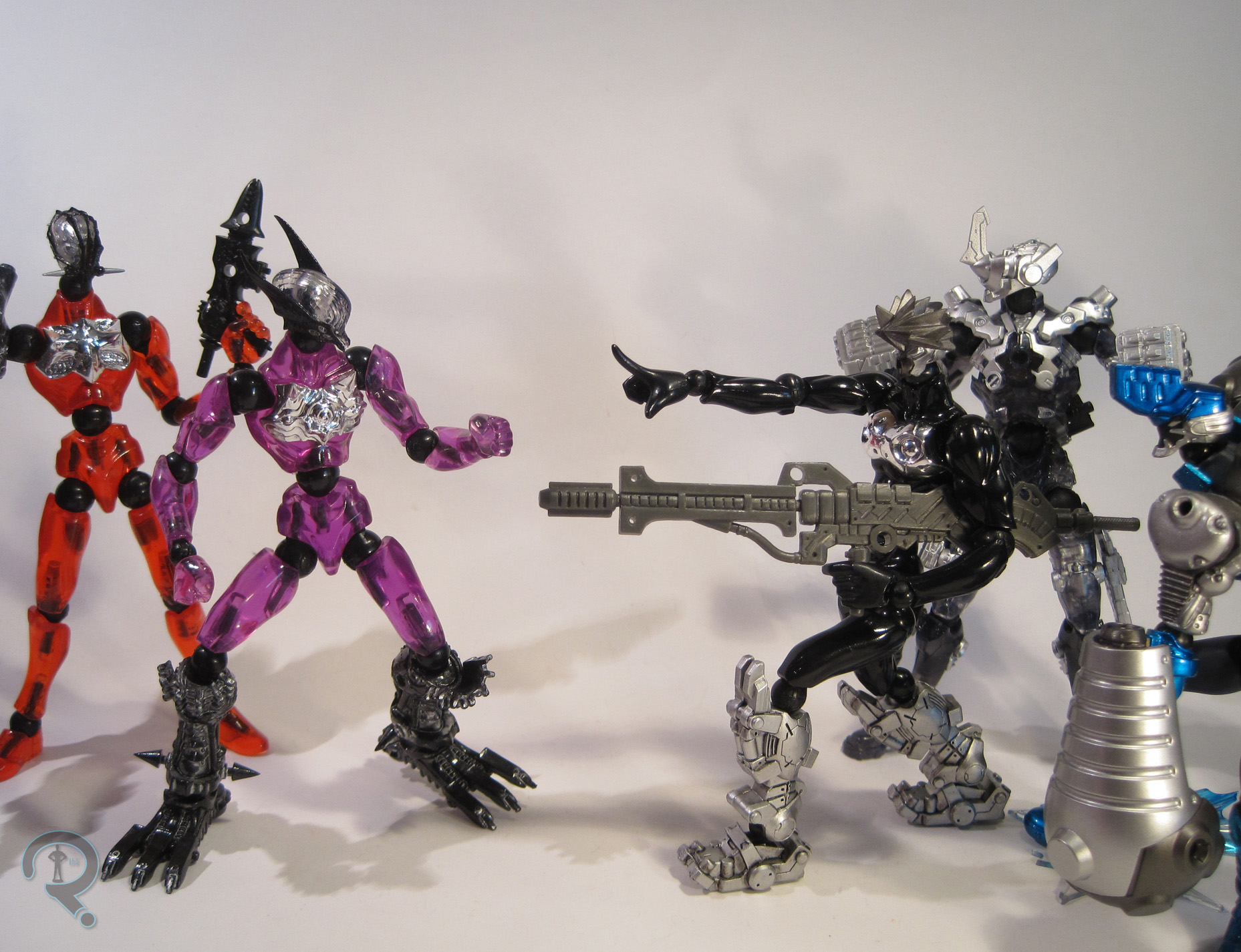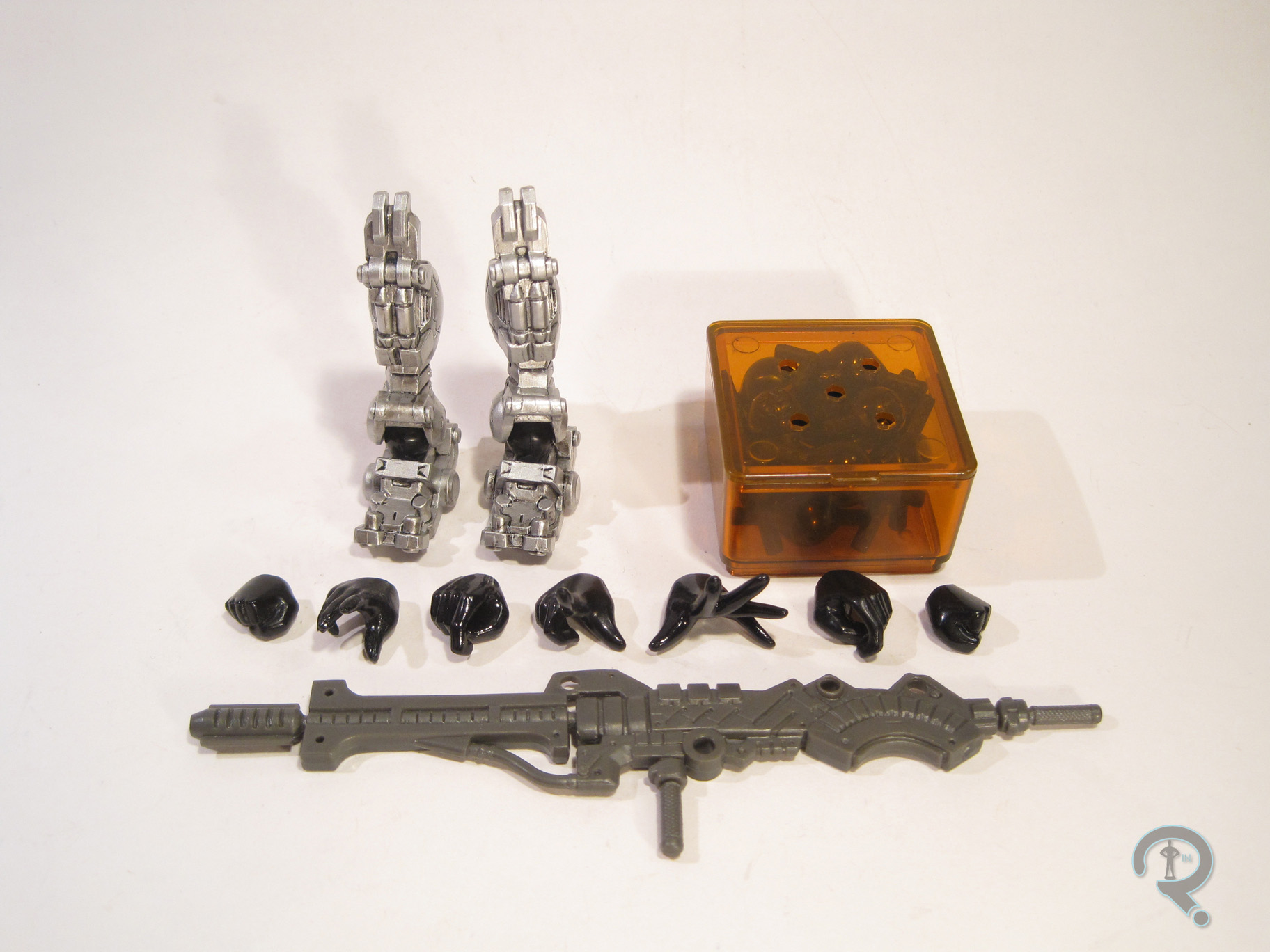addition, Xo also includes four pairs of hands (in fist, open palm, trigger finger, and pointing/splayed configurations), and the weapons compliment that we saw with Zain, but this time in a dark grey. He also comes with the requisite selection of revolver joints and pegs and a box in which to store them.