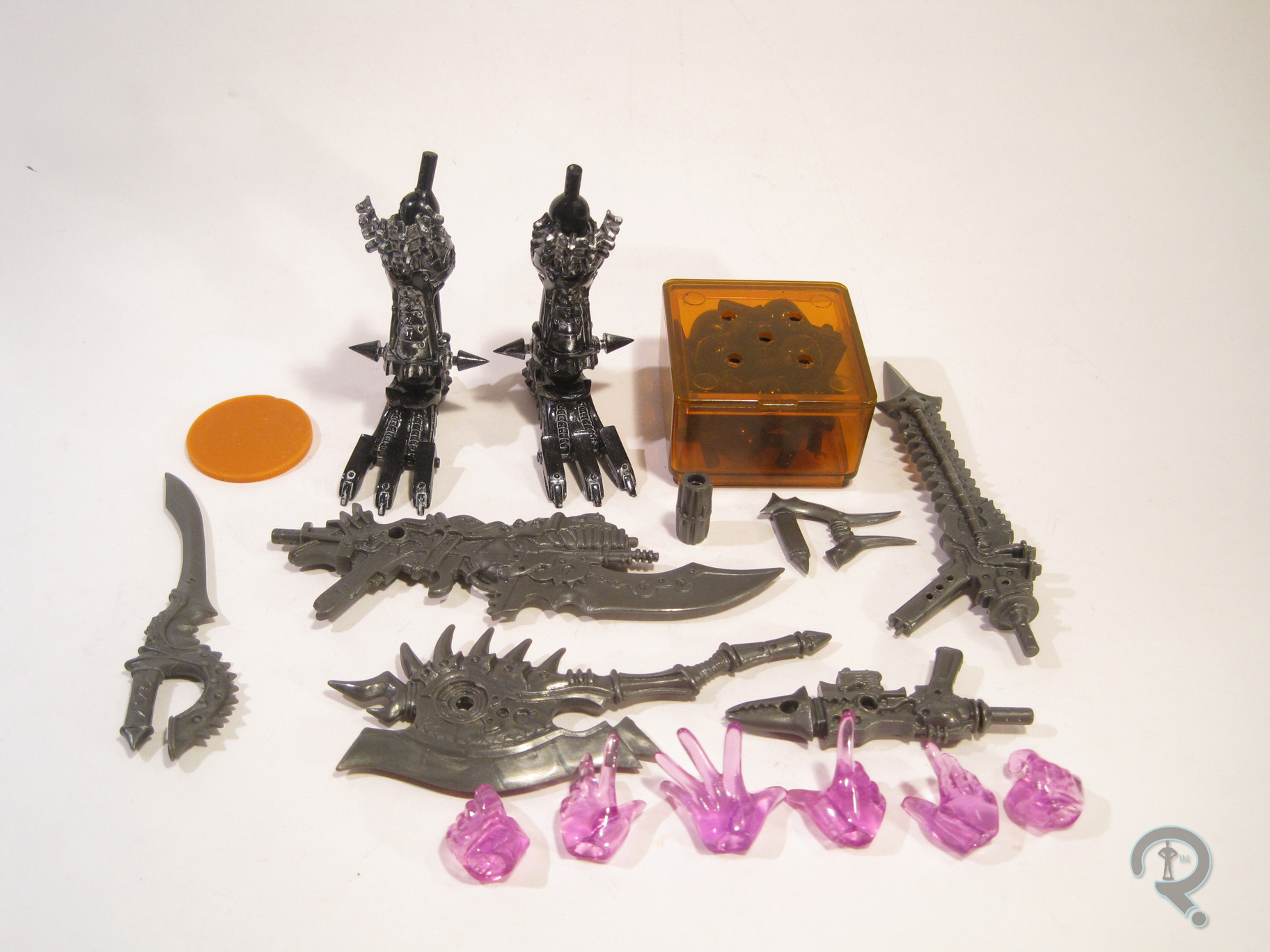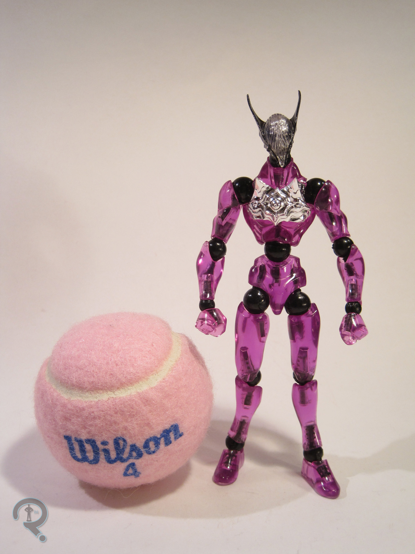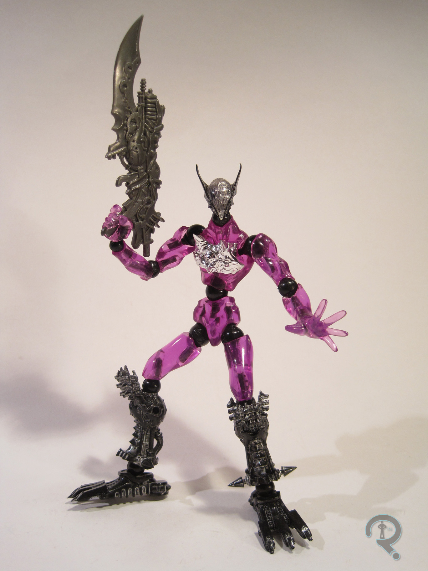 Jarknoid Xo was entry 006 in the Assemble Bog line. He’s the first of the Jarknoid trio, and signifies the start of the second “series” of figures. Xo is meant to be the leader of the Jarknoids and is in many ways an evil counterpart to Mr. Assemble. Each Jarknoid had their own descriptor, and Xo’s was “Galactic Sorcerer,” which, I have to admit, is pretty darn metal. It’s more exciting than Mr. Assemble’s “Commando Leader” anyway. The figure stands 6 inches in height and has 42 points of articulation, both of which are standard for the line. Like Zain and Mr. Assemble before him, Xo makes use of the standard Assemble Borg body as a starting point. It’s a good, basic body to build on, and its simplicity really sells the character specific pieces, so it’s definitely a good re-use. Xo gets a unique head and chest plate, just like Zain and Mr. A. Both pieces feature a similar swooping, twin-horned design, which gives Xo a nice bit