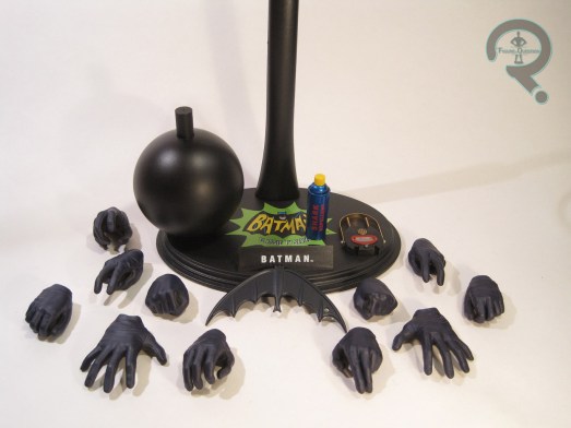 Batman is part of Hot Toys’ Movie Masterpiece Series, and he’s figure MMS 218 in that particular line. Batman is roughly 12 inches in height and, according to the Sideshow website, he has 30 points of articulation. The figure is based on Adam West’s portrayal of Batman in the 60s TV show and movie. Going by the accessories, this is specifically based on the 1966 movie.