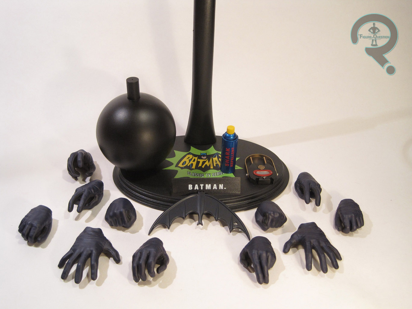 The figure’s 11 hands include: a pair of fists, a pair for carrying the bomb, a pair for doing the Batusi, a pair for the batarang, a hand for the Shark Repellant Bat Spray, a hand for the radio, and a hand gesturing with two fingers. The majority of the hands are made for interacting with the accessories, which they do superbly, and the remaining hands allow for a lot of really fun poses. The hands are all very well sculpted, matching up to the glove pieces very well. They also swap out a lot easier than most HT hands, though they still threw in a spare set of wrist pegs, just in case any accidents happen.