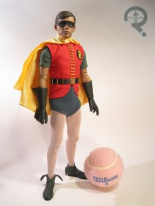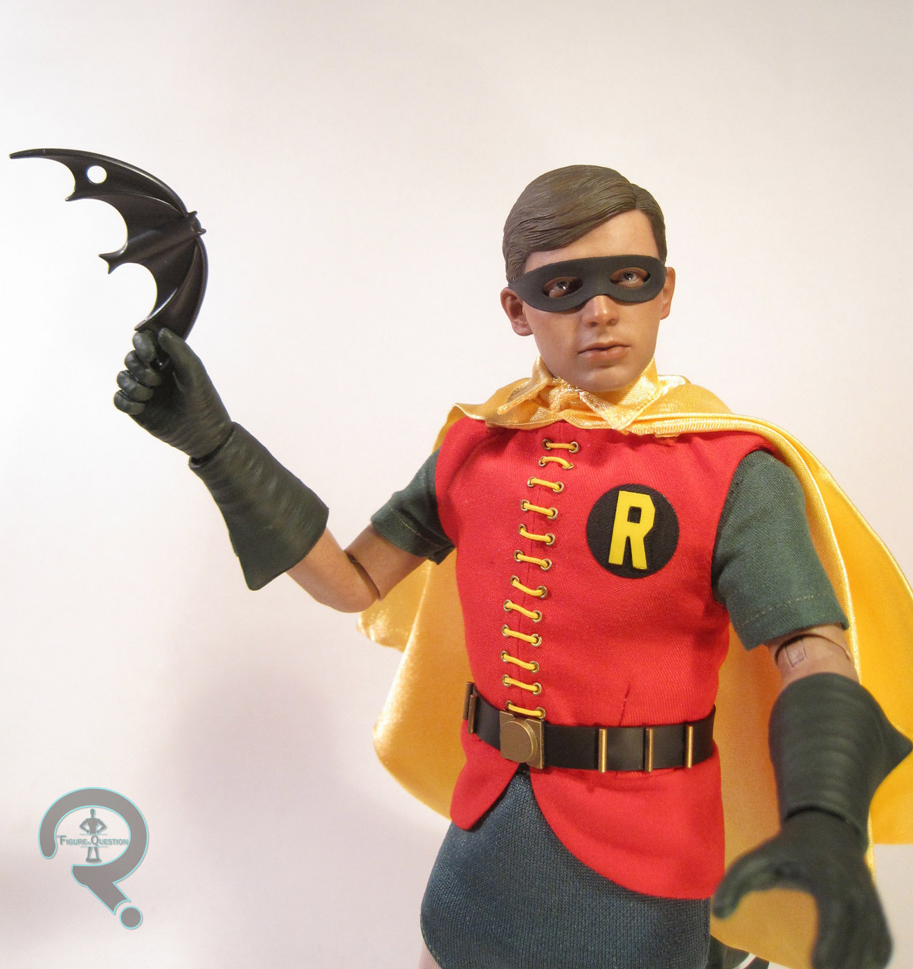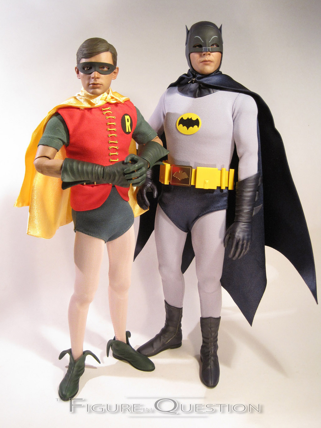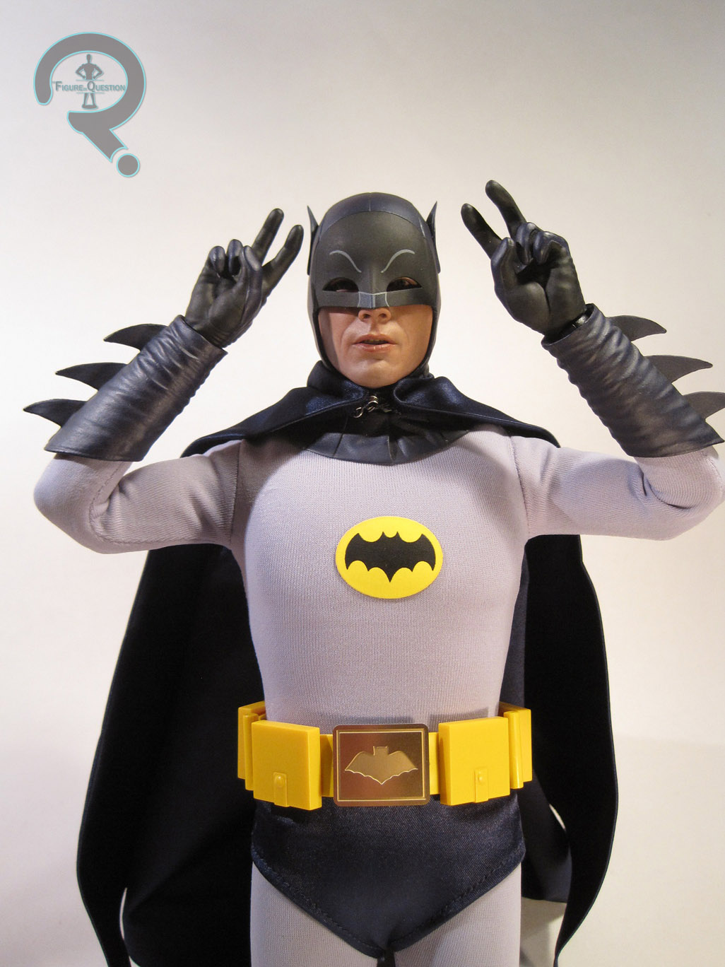 Batman’s costume is made up of nine pieces. He has a basic gray bodysuit, with a cloth cape, shorts and lower cowl, as well as sculpted boots, gloves and utility belt. The bodysuit is pretty well tailored, though some of the stitching is a bit bulky. The shorts seem a little loose, but they’re better than some of HT’s previous attempts, so they’re learning. The cape is decently tailored, though it seems too thick. They’ve also placed snaps in a few places to help with placement, which are a bit cumbersome. The gloves, boots, and belt are superbly sculpted, and very nicely painted as well. I particularly like the actual metal belt buckle, which is a wonderful recreation of the original prop. Perhaps my biggest issue with the figure’s costume isn’t actually the costume, but the body beneath it. HT tries to make use of the current version of their TrueType body whenever they can, which is understandable. However, the body is definitely too fit for Adam West as Batman. So, they’ve decided to add padding to mask this. The thing is, West wasn’t overweight, or anything, just not super cut, so the end result is that the figure looks a bit too chubby for West’s Batman.