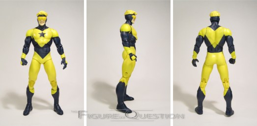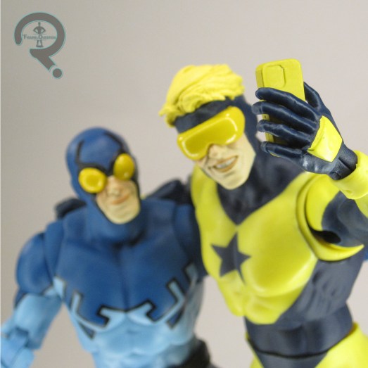 Well, at least Booster’s bio is a bit more on-point.  Given Ted’s, I was half expecting a “Super Nova” mention.  Small victories there.  Though he’s packed with a very much classically-inspired Ted Kord Blue Beetle, Booster goes slightly more modern, by virtue of ditching his somewhat absurd collar from his ’80s appearances.  I suppose I’ll allow it.  Like Beetle, the figure stands just over 7 inches tall and he has 35 points of articulation.  Booster’s sculpt is…well, it’s actually largely the same as Beetle’s.  Booster gets his own head, hands, wrist pieces, and a slightly different pelvis piece, allowing for his slightly different costume design.  The new head is on par with Beetle in terms of quality, but it’s also quite distinctly different.  The flow of the hair is quite nice, and I definitely dig the cheesy grin.  By virtue of the shared base body, Booster’s perhaps a touch too small, but not terribly far off.  What *is* rather off is the boots, which get the tops of Beetle’s boots, which are an entirely different shape.  There’s still the slight shaping of Booster’s boot sculpted above the cuff, which was also present on Beetle.  It was less obvious on Beetle than Beetle’s boots are for Booster; since Booster was getting saddled with the extra detail anyway, I’m not entirely sure why they attempted at double duty here, but at least it’s a minor detail.  Booster’s paint work is okay; not quite as good as Beetle’s, but not terrible.  There’s the obvious painting over of the boot details, which is a bit goofy looking.  Additionally, thanks to the paint on the shins, plus the molded yellow higher up, and then the slightly different material on the knees, there are no less than three different yellows in the space of about an inch.  From the knees up, however, he looks pretty great.  His goggles are opaque, just like Ted’s, and the face likewise gets some really nice accenting to give it a little more life.  Booster is packed with a smart phone (with a yellow case to match his costume), a blast effect to clip onto his wrist, and his robot buddy Skeets, a display stand, and a collector card.  Skeets, rather than getting his own stand or attaching to Booster directly, plugs into the larger base shared between the two of them.  It’s a rather short arm, and not removable from Skeets.  It’s also completely opaque, and it doesn’t plug into anything other than the very large base, which proves rather limiting for him.  But, at least he’s included, which is certainly more than can be said of other Booster Gold figures.