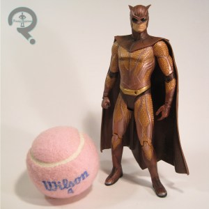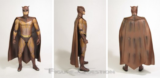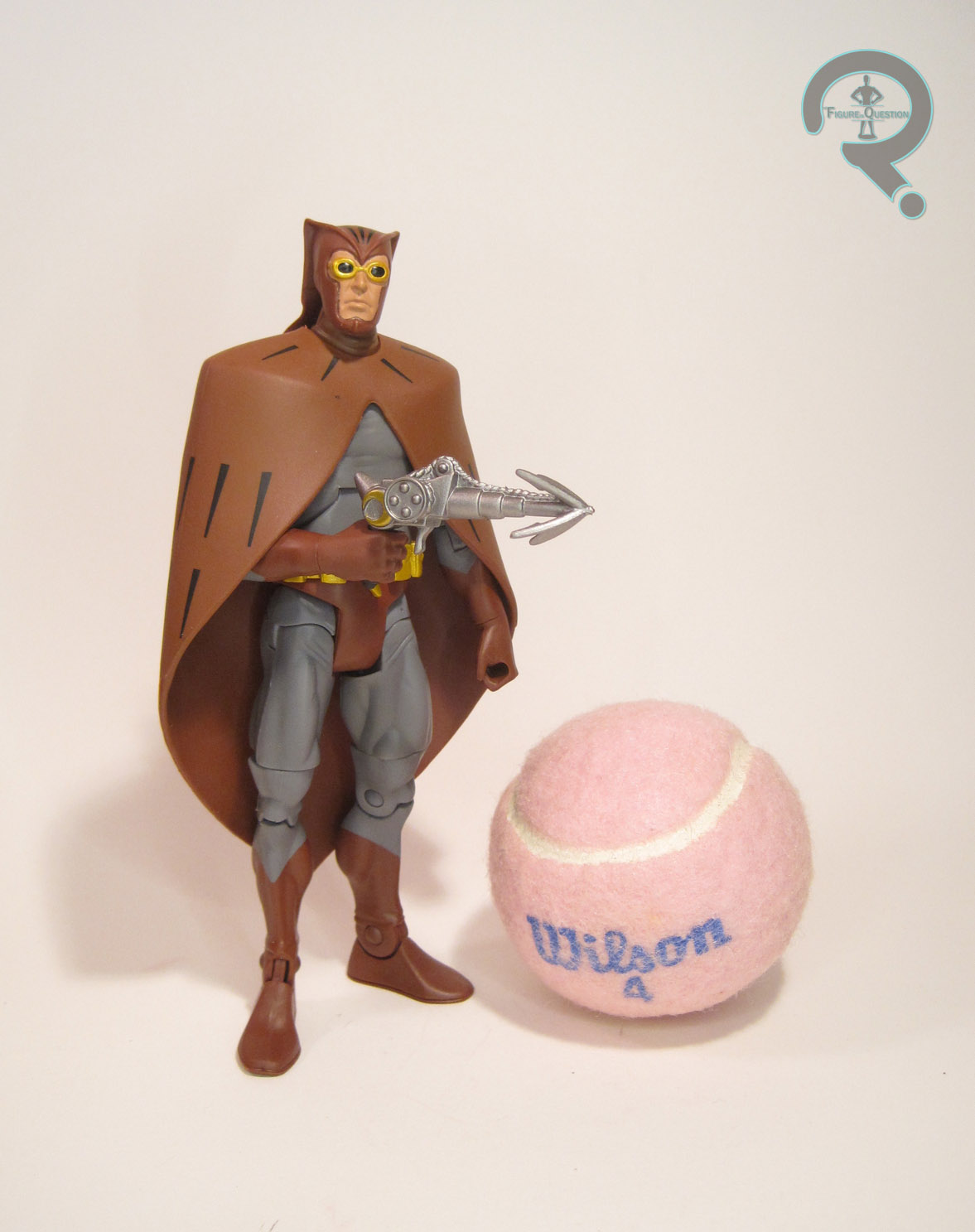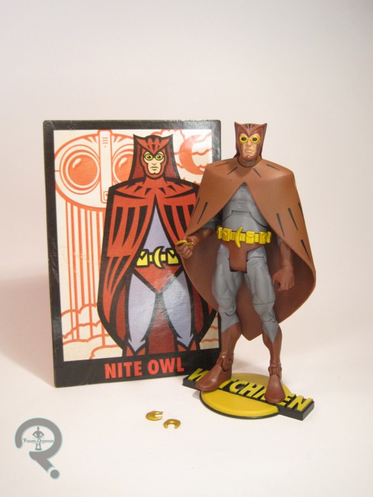Nite Owl was the fourth figure in Mattel’s “Club Black Freighter” subscription, released back in 2013.  He’s based on the comics Nite Owl design, of course, which is a more simplistic look than his more sculpted look from the film, but I feel a slightly more polished and to the point design.  The figure stands 6 3/4 inches tall 23 points of articulation.  The whole Club Black Freighter set was designed to fit stylistically with DC Universe Classics, and a lot of this was done via parts re-use from that line.  For Nite Owl, this means he uses the standard mid-sized arms, legs, and pelvis, along with a new torso and head, as well as add-ons for his cape and belt.  The legs are the end of DCUC legs, meaning they’ve had the rocker-ankles removed.  It’s definitely an annoyance, and it means he can’t really ever keep his feet flat on the ground, which looks rather goofy.  On the plus side, all of the newly sculpted pieces really do look cool.  The head’s a solid piece of work, and replicates Gibbons’ take on Nite Owl quite nicely.  His hard plastic cape, though very cool looking, effectively renders his arms motionless from the elbow up.  The end result to all of this is a figure that’s not really good for anything but standing around.  But at least he looks good, I suppose.  The paint work on Nite Owl is decent enough, and certainly better than a lot of Mattel’s output.  It’s clean and matches well with the art from the book.  It’s not the most thrilling color combination, but that’s true to the character, so one can hardly complain.  Nite Owl is packed with a display stand, three owl-arangs, and a grappling gun, as well as big novelty card thing with an art-deco sort of illustration.  The stand’s fine, but he has some trouble successfully holding any of the other extras.